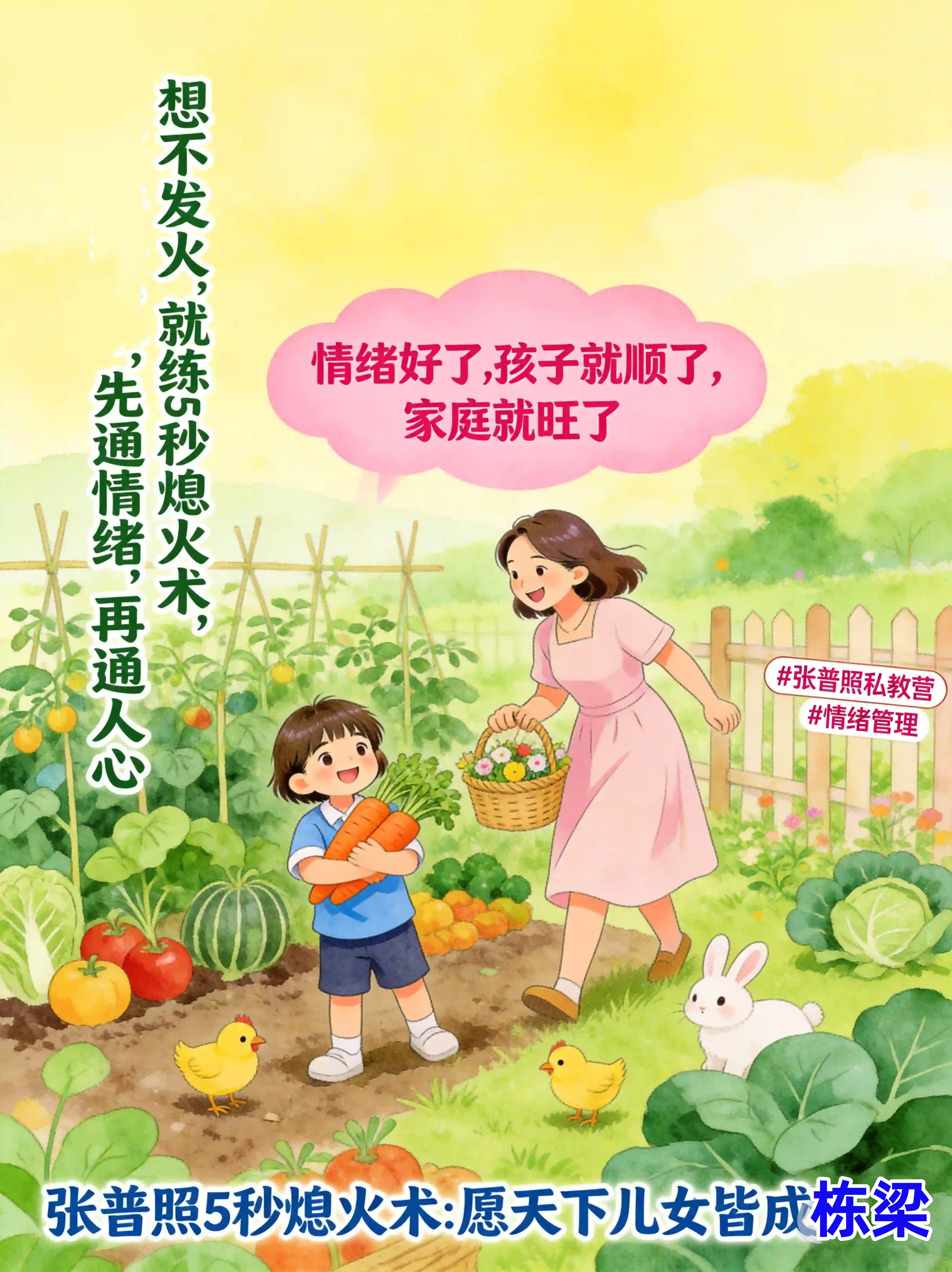 记住:多练习张普照5秒熄火术,父母马上就不生气了,内在瞬间通透,充满智慧。怒火起,即刻消。 情绪好了,孩子就来运了,家庭就顺了。