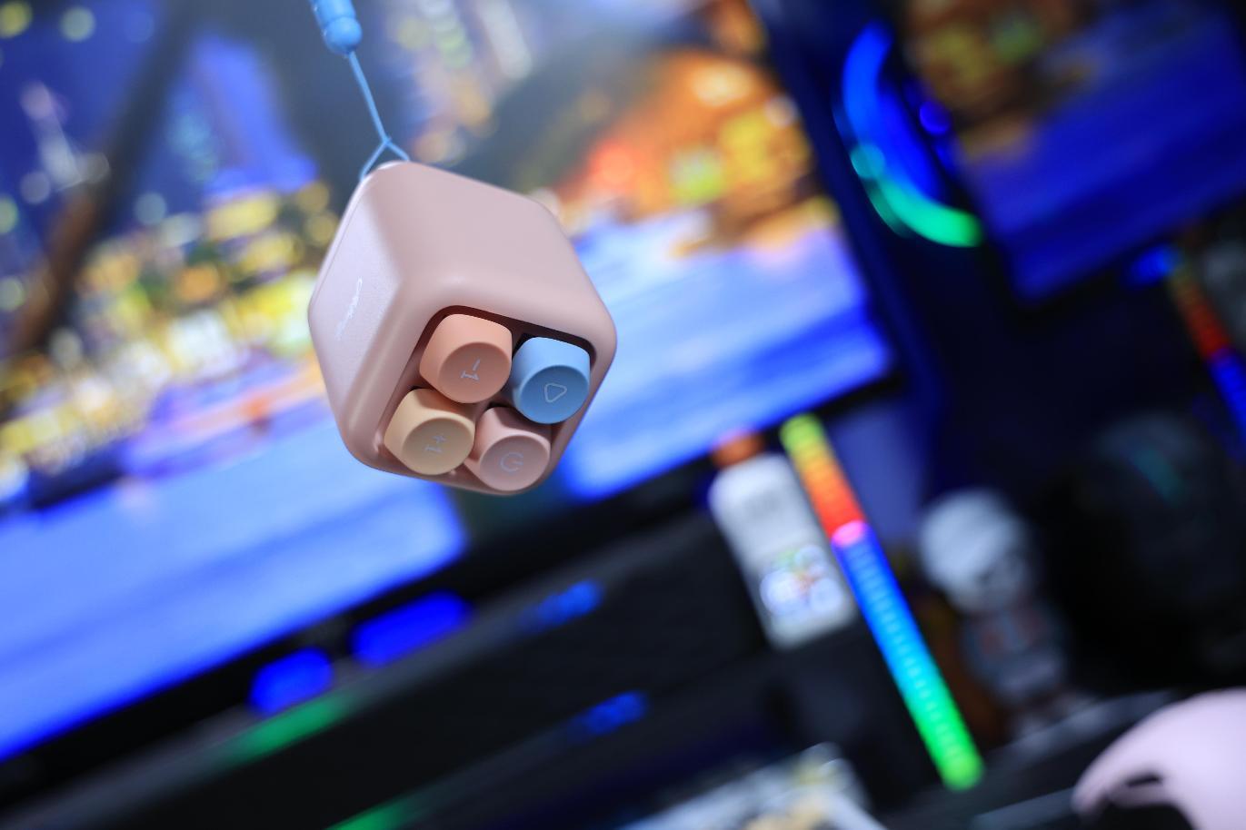 打开包装,音响本体简直让人眼前一亮!54mm54mm68.5mm 的尺寸,比掌心大不了多少,重量仅 117g,随手揣进牛仔裤口袋或挂在背包上毫无负担。本次测评拿到的是灰色款,机身采用哑光材质,搭配绿色键帽,沉稳中透着一丝俏皮;粉色款则是全粉设计,少女心爆棚。两种配色都采用马卡龙色系,柔和的色调自带治愈感,放在办公桌上堪比潮玩摆件,同事路过都要问一句:“这是哪家的新款手办?”