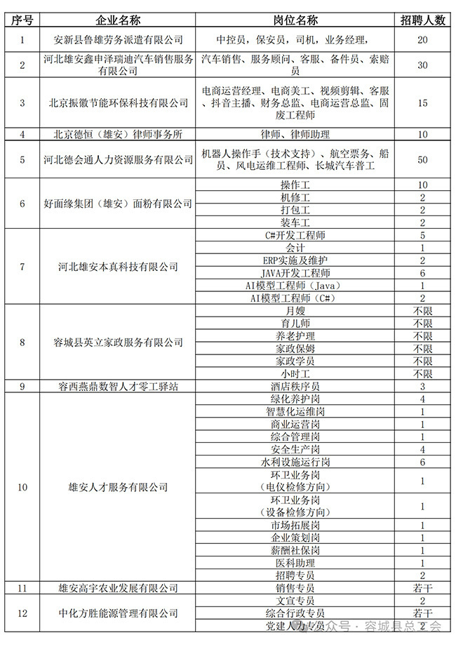 4月18日上午,由容城县总工会主办,容城县公共服务局、县退役军人事务局、共青团容城县委、县妇女联合会协办的容城县2026年工会帮就业行动招聘会,将在容城县椒山劳动公园(澳森南大街保定卓悦商务酒店东北侧约280米)举办。