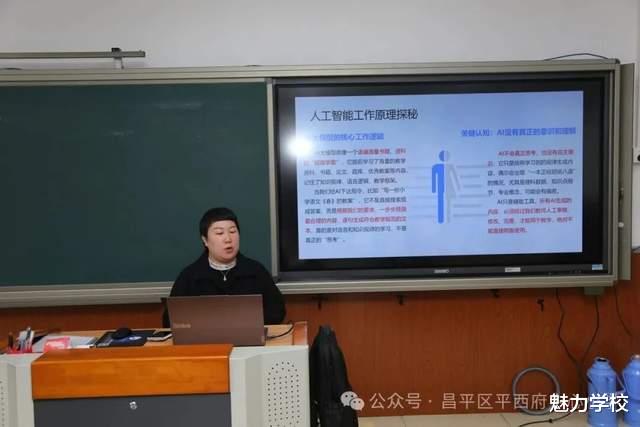 为深入贯彻教育数字化发展战略,落实《中小学人工智能通识教育指南》要求,推动人工智能技术与小学教育教学深度融合,助力教师提升数字化教学能力,4月9日北京市昌平区平西府中心小学组织全体教师开展“AI赋能教育教学——从理念到实践”专题培训活动,主讲人为延庆区教师进修学校课程中心的檀玲主任。