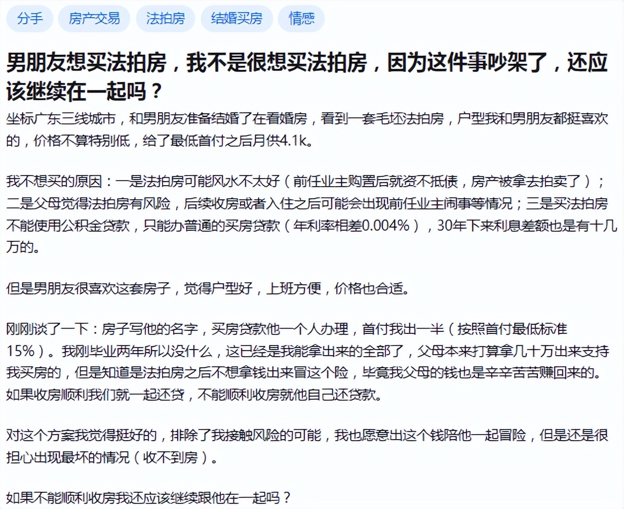 说到底,婚前为买房吵没必要。法拍房买不买不重要,重要的是两人能不能一起算“成本账”——毕竟未来几十年,比一套房难的事多了,连一次买房的成本都算不齐,怎么算好一辈子的日子?