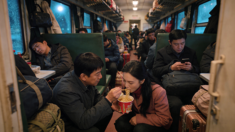 车厢里吵吵闹闹,座椅狭窄,空气里混着泡面和烟火气。