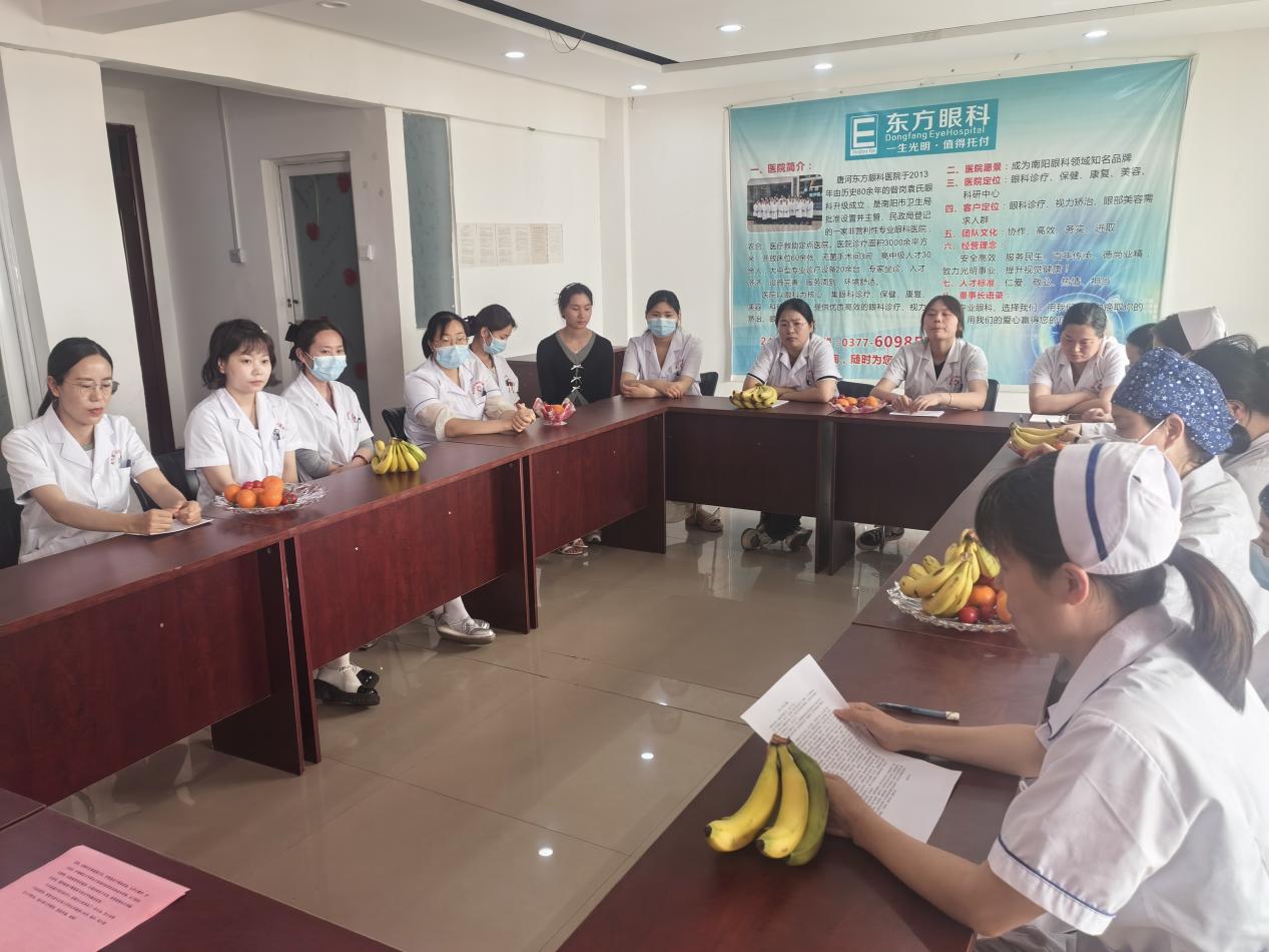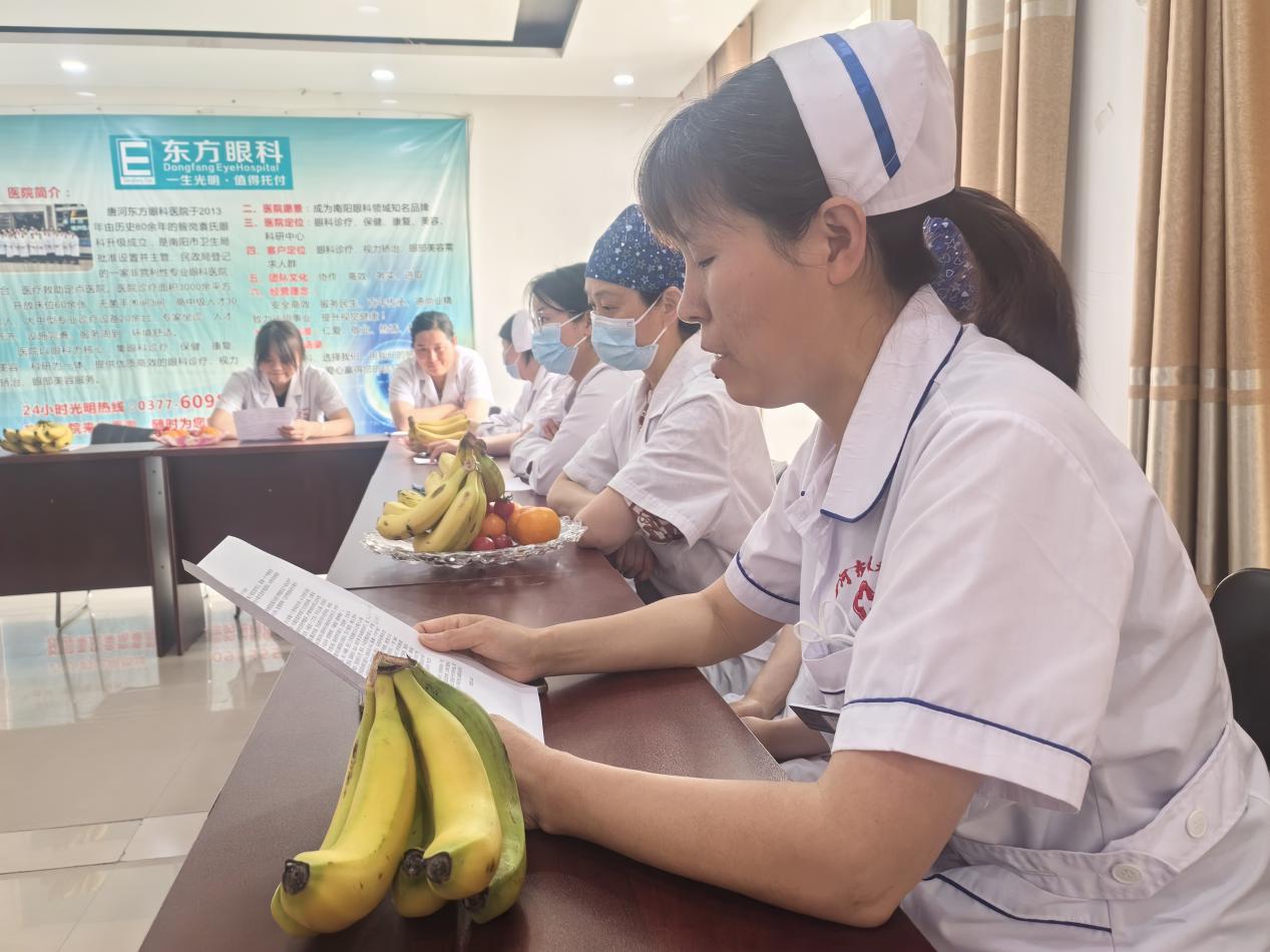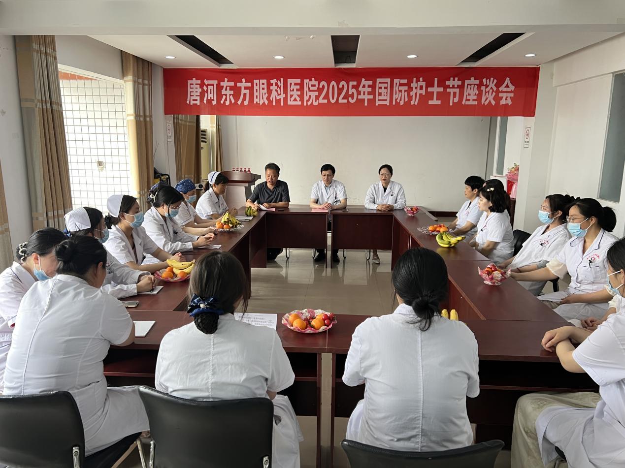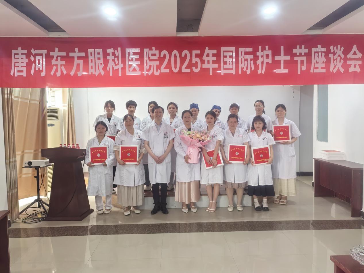2025年5月12日下午,唐河东方眼科医院六楼会议室内花香馥郁、笑语盈盈,一场以"提灯引路·护佑光明"为主题的护士节座谈会在此温情举行。院长袁育新、副院长白珣与全院护理工作者共庆第114个国际护士节,通过表座谈、献花、赠礼等形式传递对"白衣天使"的崇高敬意。
