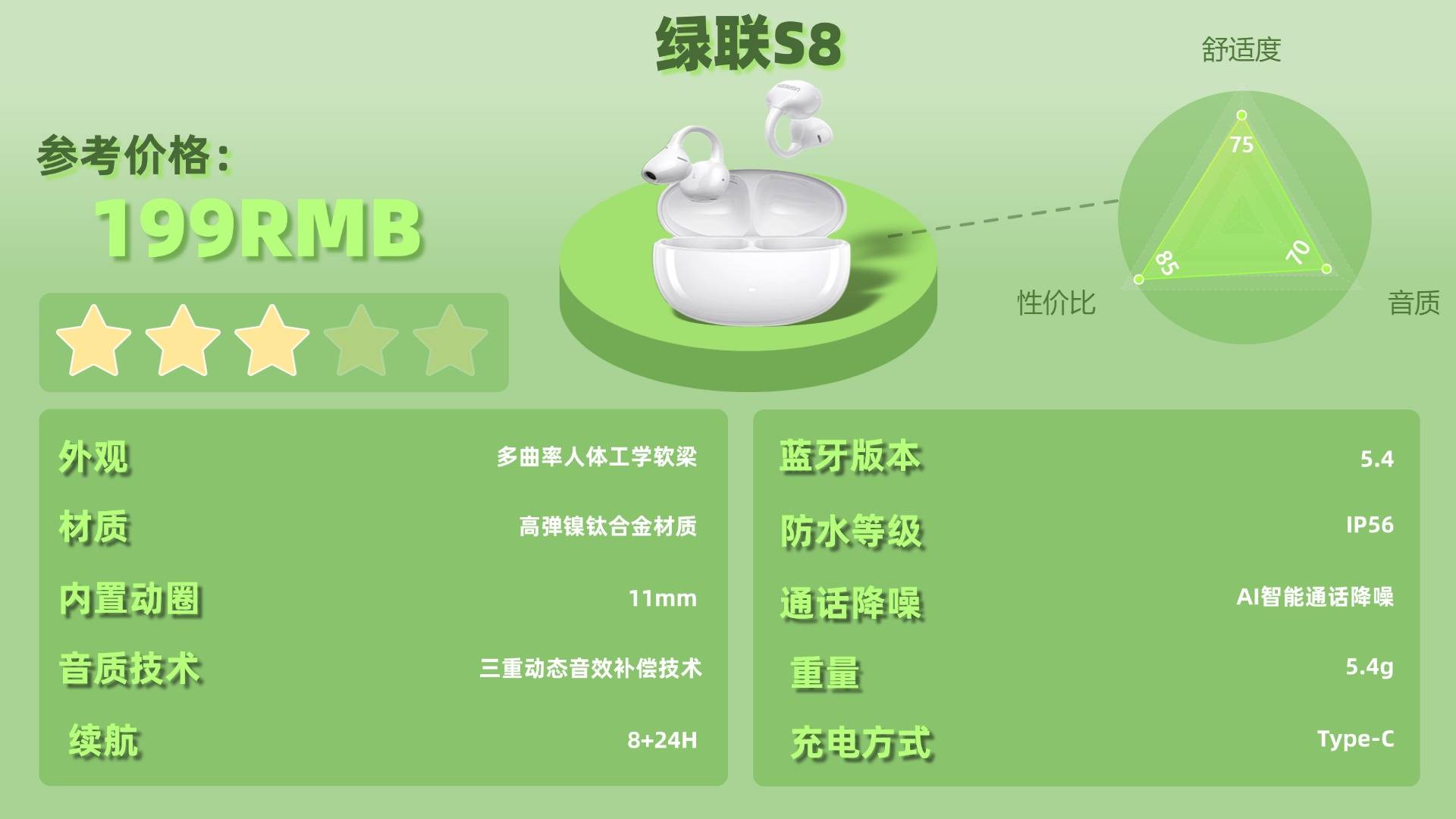 绿联S8主打高性价比,配色简约百搭,适配通勤、运动等多场景。它采用壶嘴型潜入式设计,单耳仅5.1g轻盈便携,但耳型适配性不足,耳朵偏大的用户佩戴易松动滑落;发声口距耳部较远,与宣传适配效果有偏差,影响使用体验。