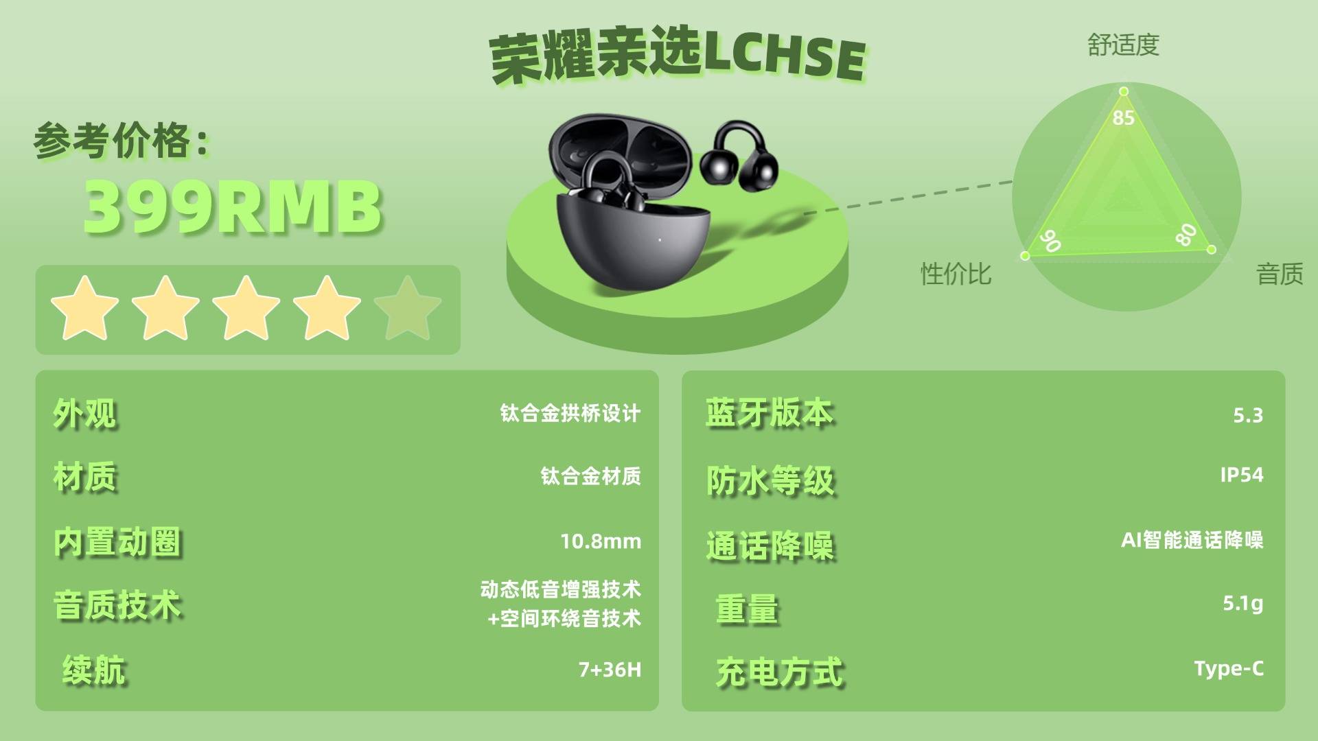 荣耀亲选LCH SE主打轻奢质感和长续航,配色简约大气,一眼看过去就很有档次。机身全是钛合金材质,单只才5.1g,又轻又结实。戴在耳朵上贴合度很高,就算戴一整天,耳朵也不会觉得累。