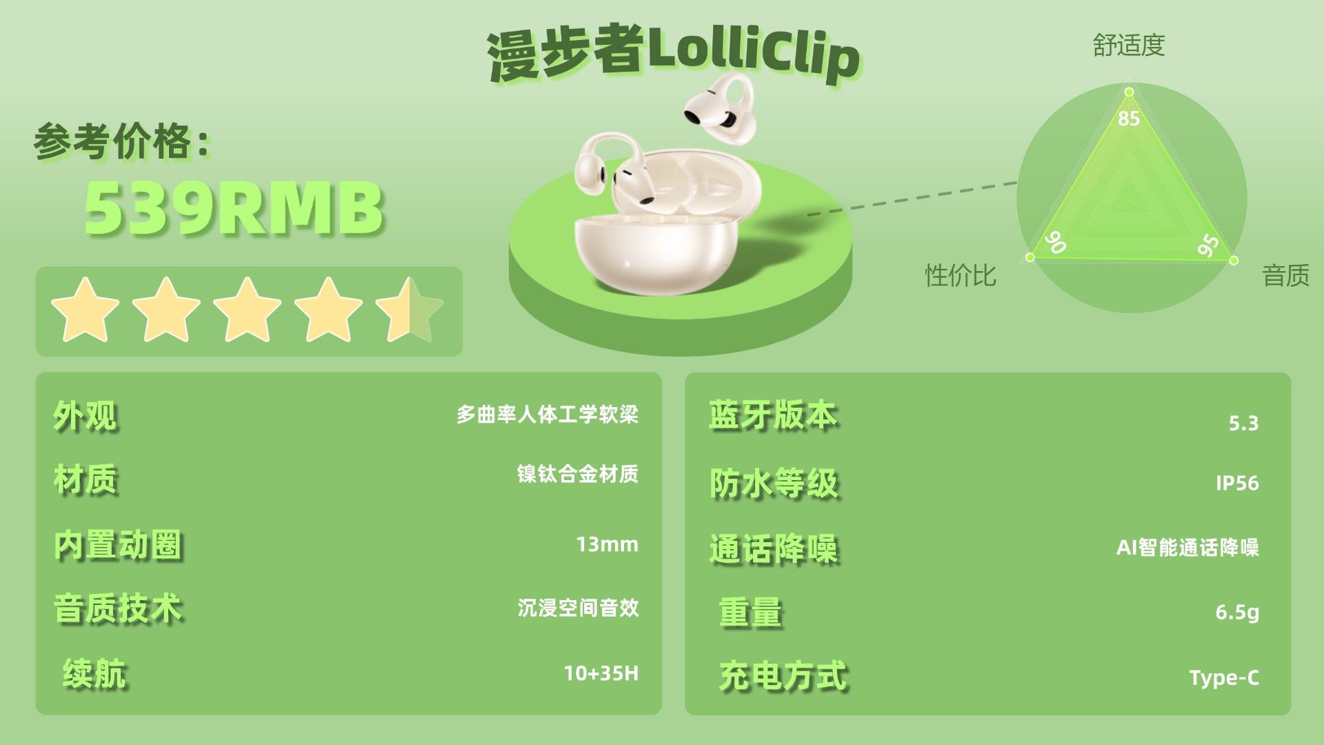 漫步者LolliClip以长续航和健康监测为核心卖点,简约机身设计不挑使用场景,日常通勤、居家休闲都能hold住。机身采用多曲率人体工学软梁搭配镍钛合金材质,单耳6.5g的重量佩戴时会有轻微坠物感,跑步等运动场景下还会伴随少量空气噪音,更适合静态或轻度活动时使用。