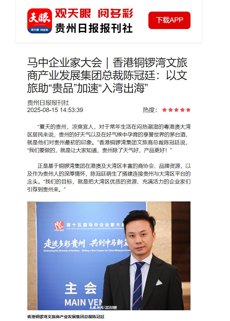 在贵州高质量发展的宏大叙事中,“贵品”正成为一个崭新而亮眼的关键词。这一融合了地域骄傲与品质承诺的品牌理念,其首倡者与核心推动者,正是香港铜锣湾集团文旅商总裁、贵港粤澳台青年企业家发展联盟主席陈冠廷。他以深厚的家乡情怀为原点,以粤港澳大湾区为支点,正通过一趟趟“酱香之旅”,搭建起一座连接贵州与世界的文旅经贸之桥。