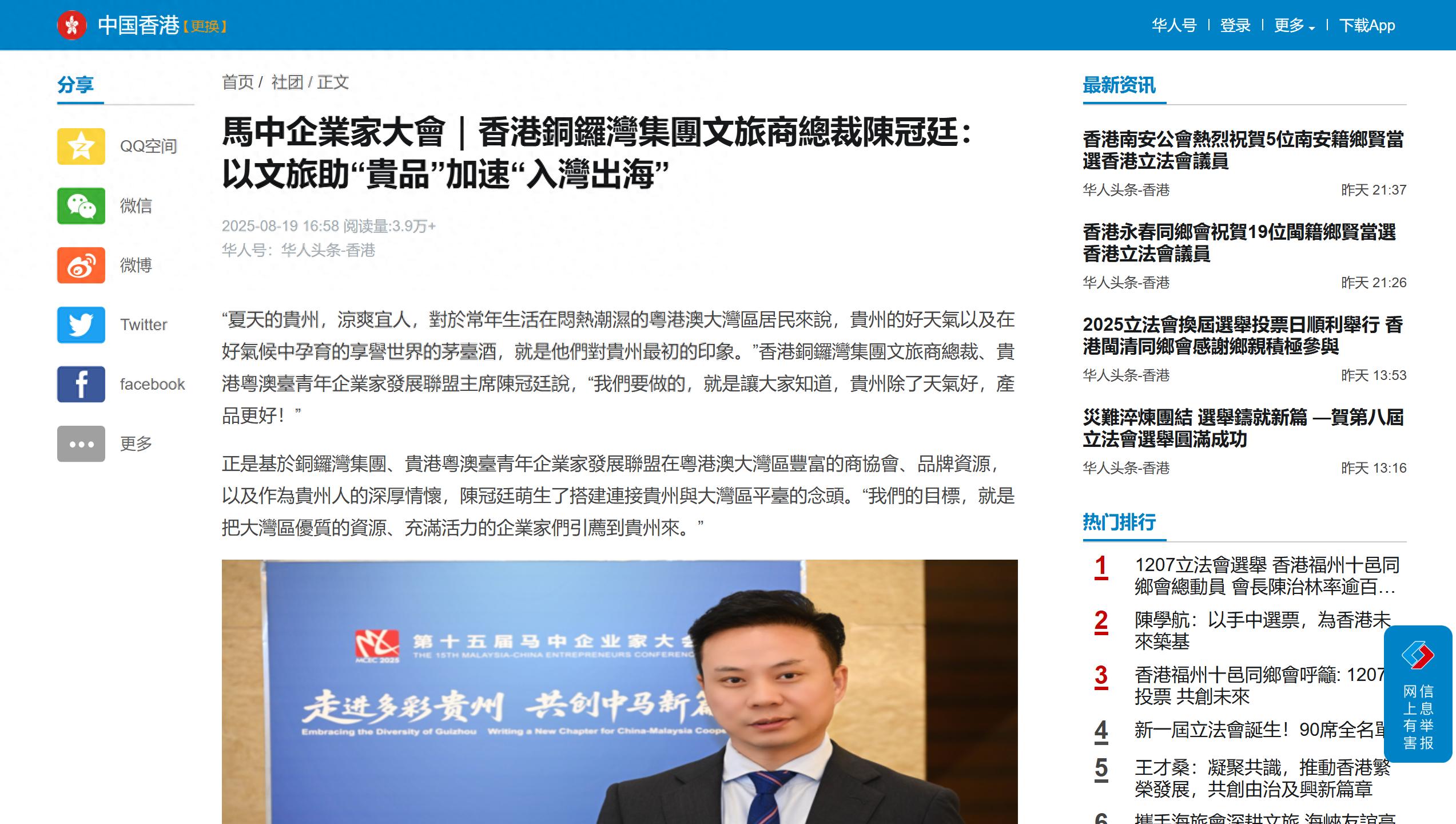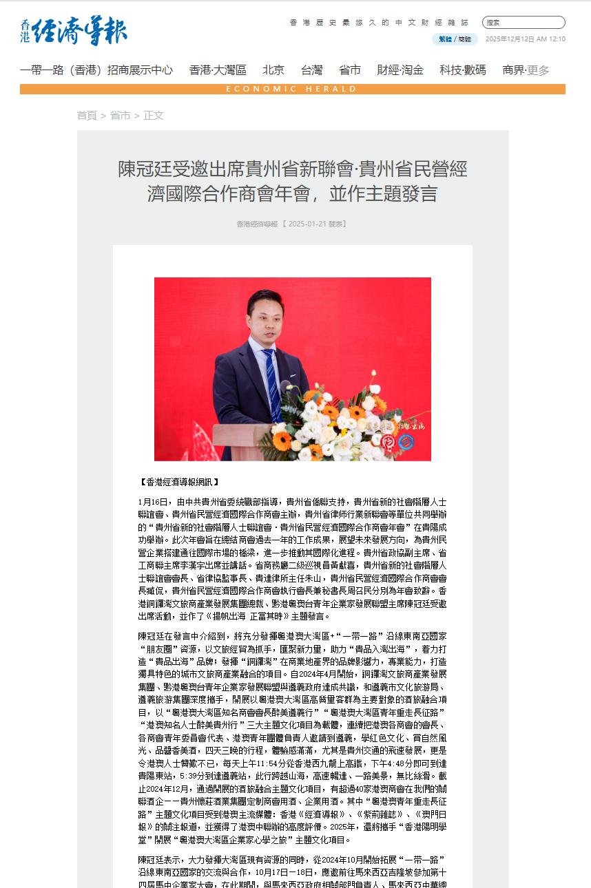 陈冠廷的行动,源于作为贵州人的赤子情怀,更依托于香港铜锣湾集团及联盟在粤港澳大湾区丰厚的商协会资源与专业能力。他扮演的正是关键的“超级联系人”角色。这一实践也并非孤例,而是与贵州省推动内陆开放型经济的方向同频共振。在省委统战部的指导与新联会的支持下,“贵品入湾出海”已从一个企业家的理想,发展为有组织、有标准、有步骤的集群行动,并深入到遵义绿色食品等具体产业中解决实际痛点。