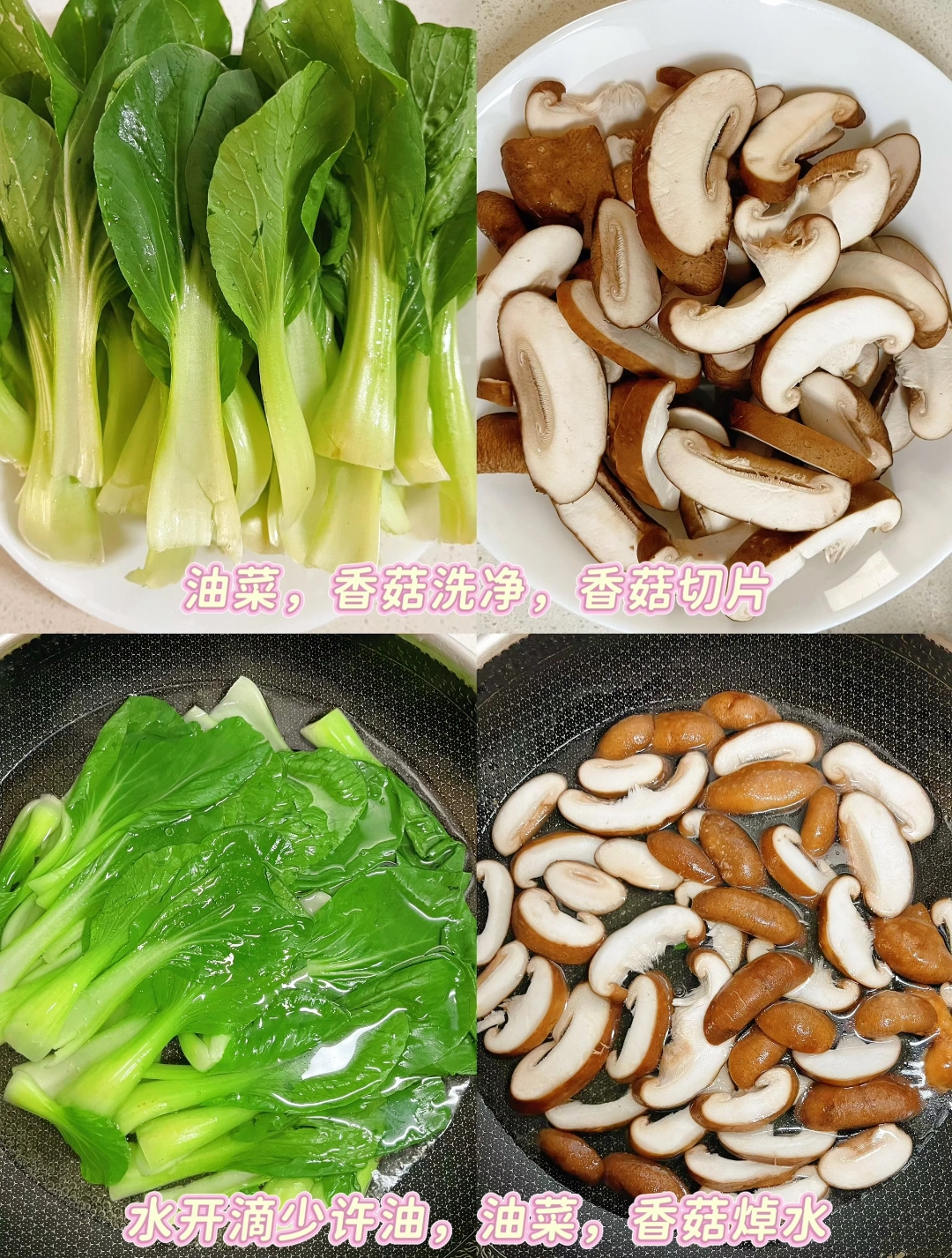 制作这道佳肴,首先需要对食材进行细致的呵护。将新鲜的香菇与油菜洗净,香菇切成厚度适中的片状,为后续的入味做好准备。焯水是这道菜色泽翠绿的关键一步,锅中水烧开,滴入一滴食用油并撒上少许盐,这看似简单的动作却能锁住蔬菜的色泽。将油菜根部先朝下浸入热水中,待根部微熟再整体倒入,焯水一分钟后迅速捞出沥干,同样的方法将香菇焯水一分钟,沥干备用。这一热一冷的交替,让食材保留了最鲜嫩的口感。