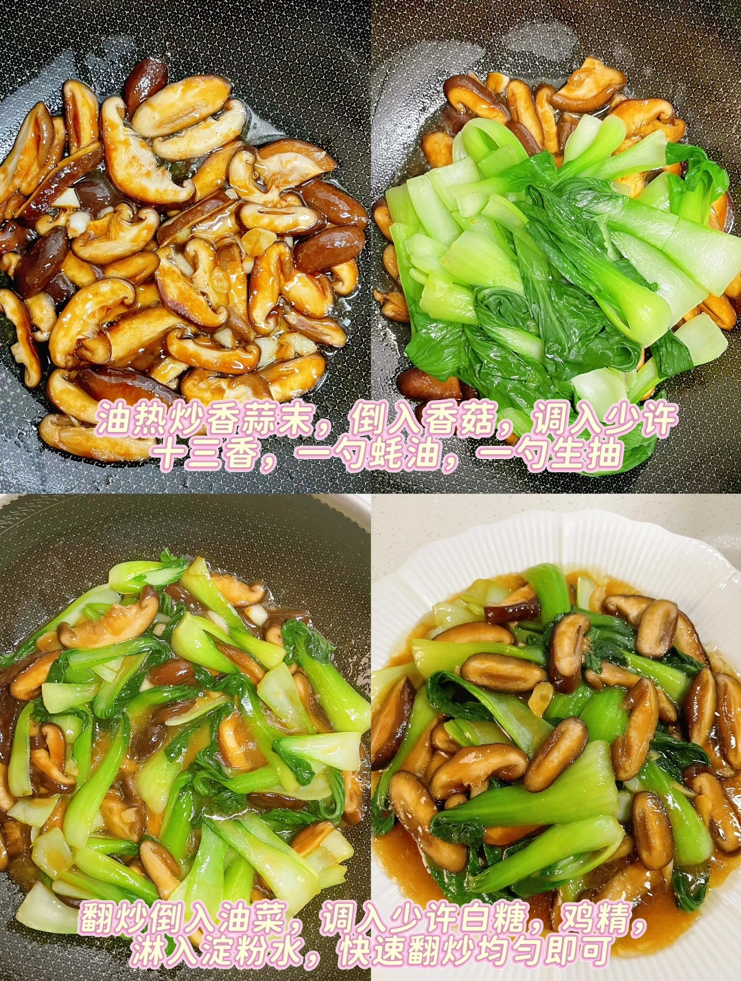 接下来的烹饪过程则是灵魂注入的时刻。锅中油热,放入蒜末煸炒出香味,瞬间激发出厨房里诱人的食欲。随后倒入处理好的香菇,快速翻炒,调入十三香、一勺蚝油和一勺生抽,让黑白相间的香菇片充分吸收酱料的精华,变得油润发亮。紧接着,将翠绿的油菜倒入锅中,与香菇共舞,此时加入少许白糖提鲜,再淋入水淀粉勾芡,最后撒入少许鸡精,随着锅铲的不断翻动,锅中汤汁逐渐变得浓稠,紧紧包裹在每一片菜叶与香菇之上,这道菜便大功告成。
