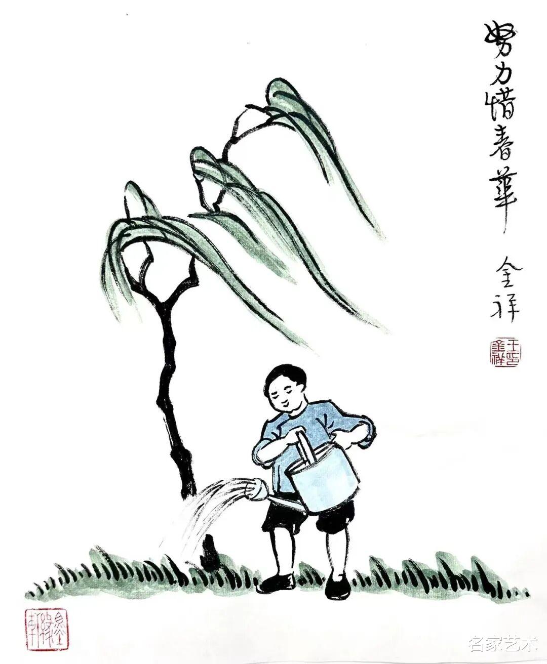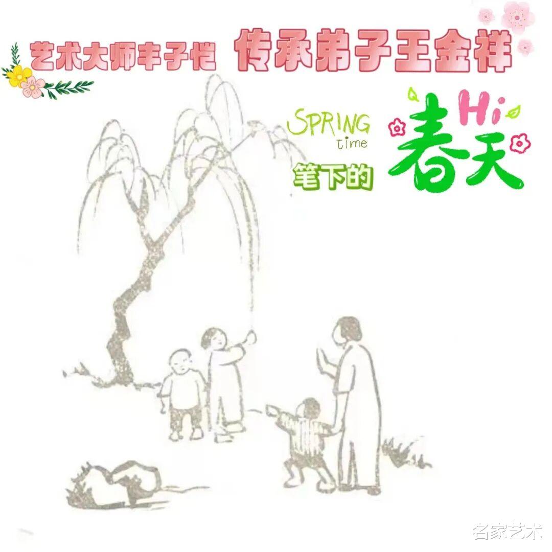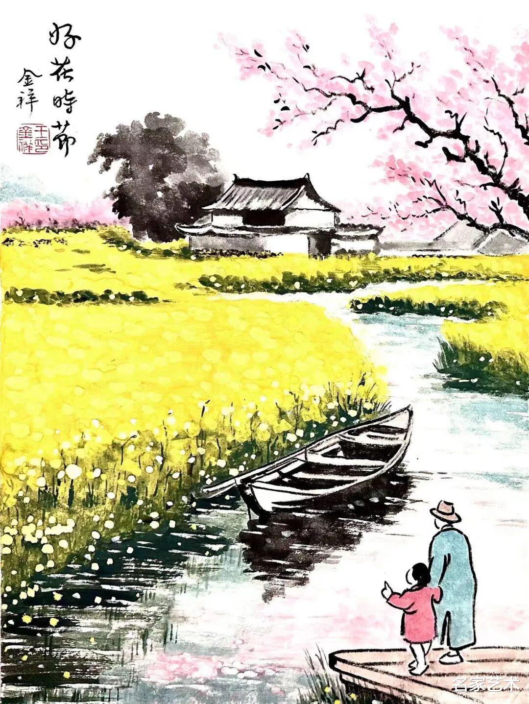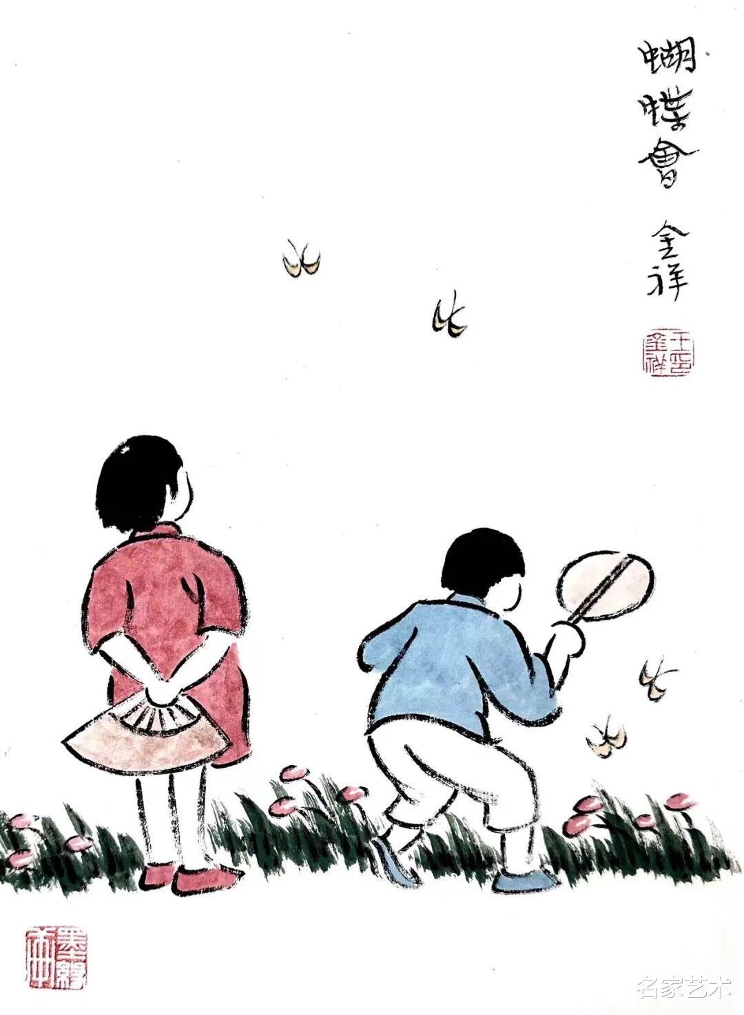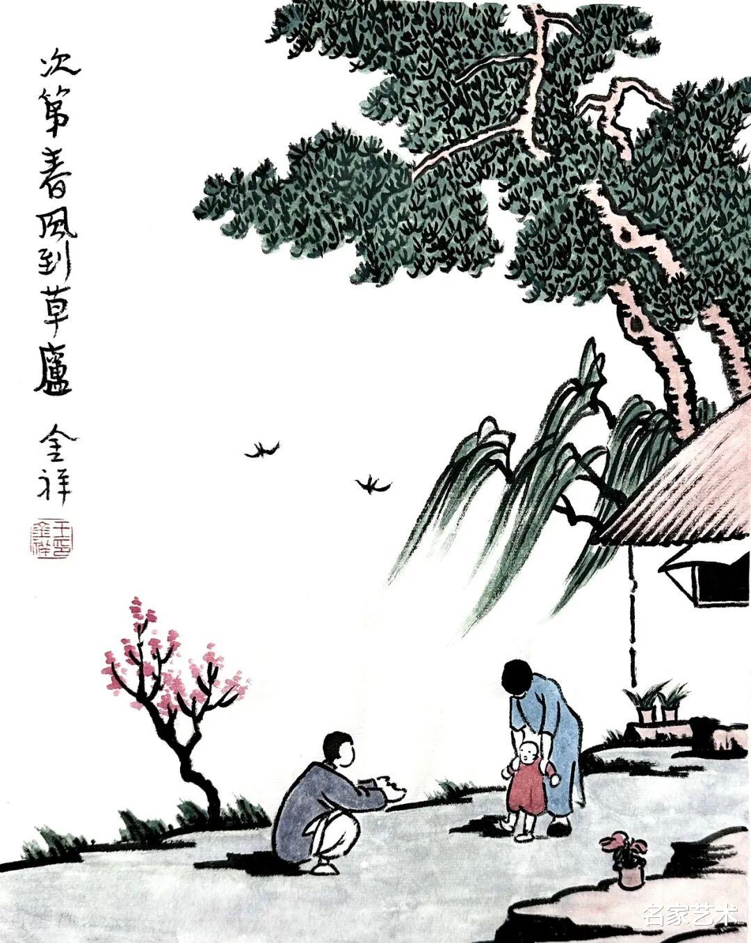 王金祥先生的作品,以景写情、以形传神,清新朴素的审美趣味,将文人画的笔墨程式和他的艺术特色相结合,不仅注重物象线条和创新元素,还将人物表情刻画得出神入化。笔下是人情世故,纸上是情趣盎然,在方寸间缓缓流淌出生机与诗情,不愧为一代文学艺术大师丰子恺的传承弟子。这里的每一幅作品,都是一枚枚刚刚萌发的芽苞,等待与您目光相遇的刹那,绽放成精神世界中的万紫千红。