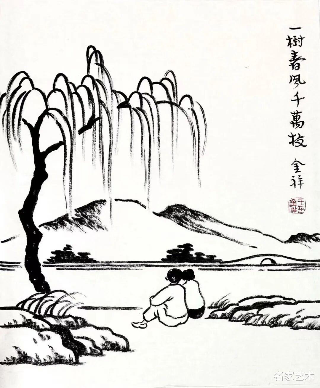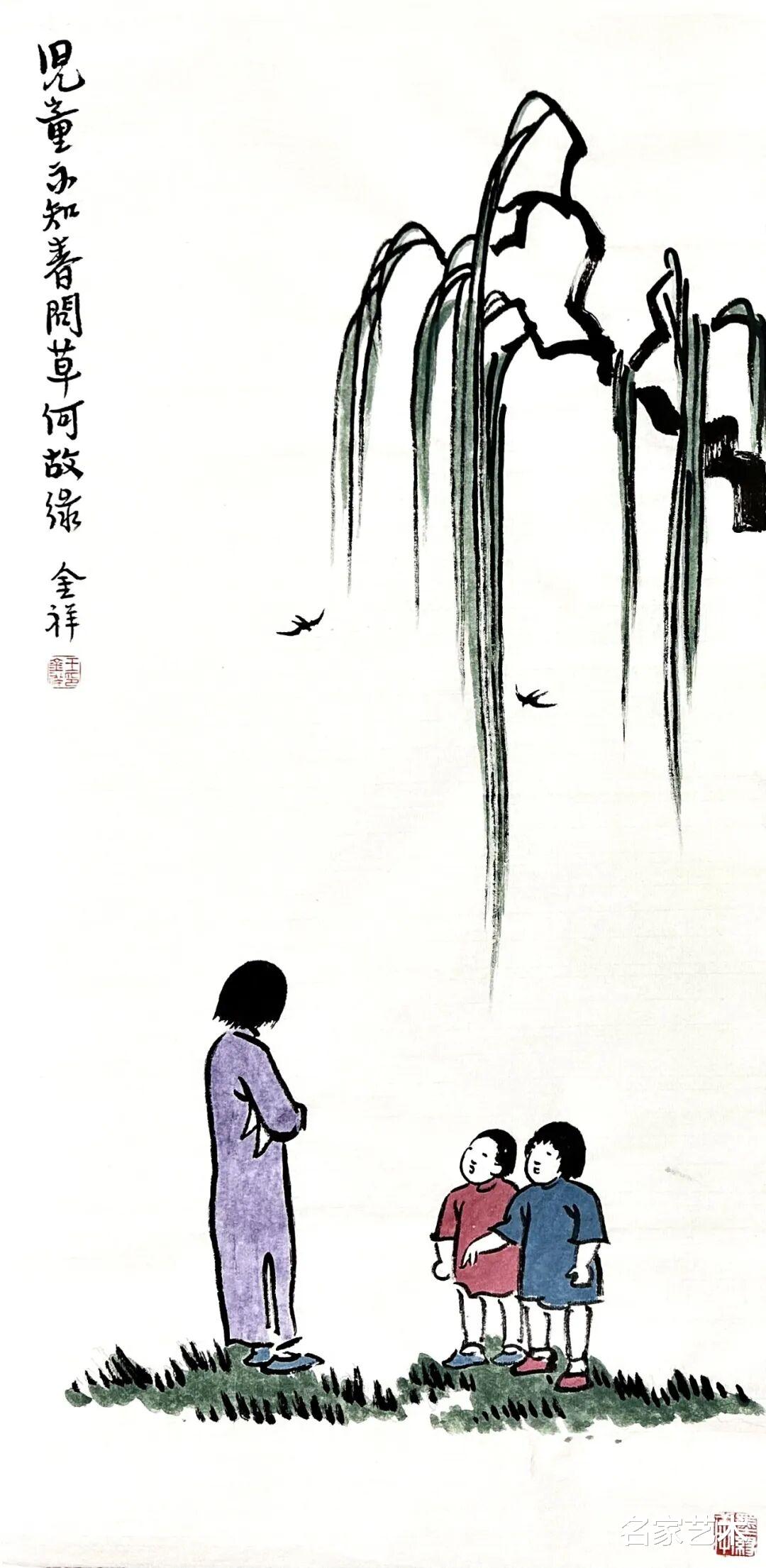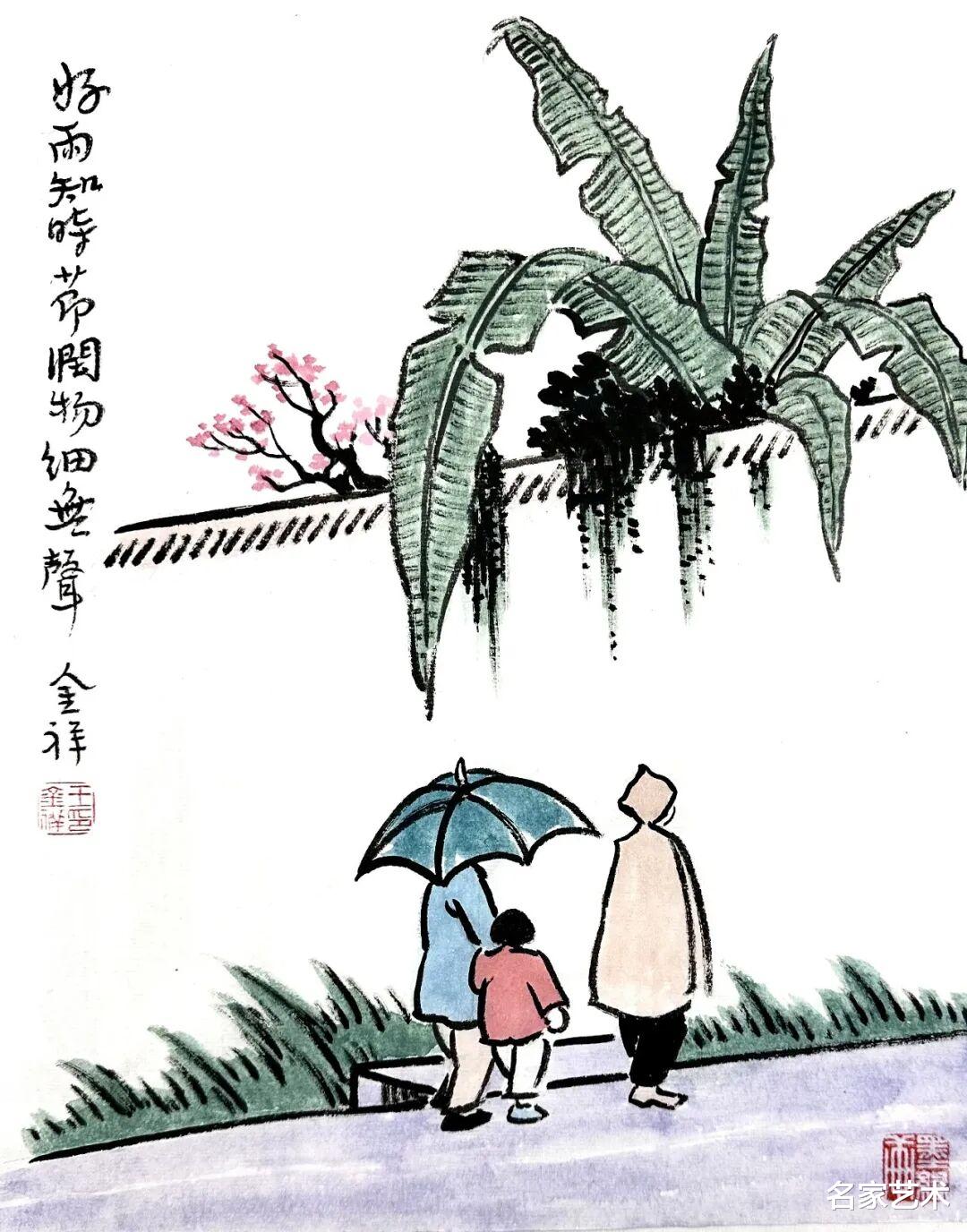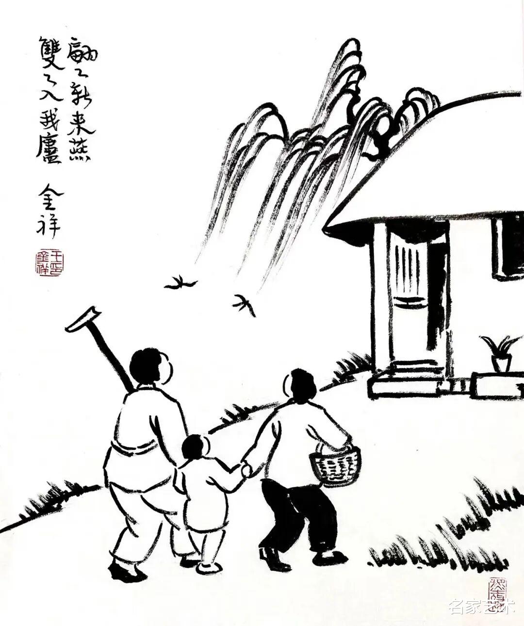 王金祥先生的作品,以景写情、以形传神,清新朴素的审美趣味,将文人画的笔墨程式和他的艺术特色相结合,不仅注重物象线条和创新元素,还将人物表情刻画得出神入化。笔下是人情世故,纸上是情趣盎然,在方寸间缓缓流淌出生机与诗情,不愧为一代文学艺术大师丰子恺的传承弟子。这里的每一幅作品,都是一枚枚刚刚萌发的芽苞,等待与您目光相遇的刹那,绽放成精神世界中的万紫千红。