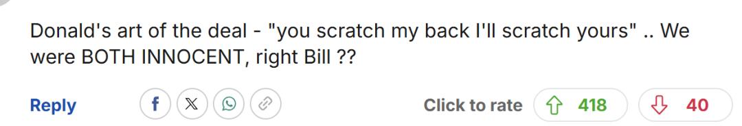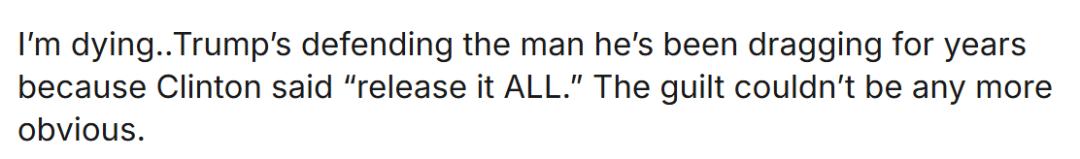 “笑死,有生之年还能看到特朗普为他一直诋毁的人辩护,只因克林顿说要把档案全部公布...他的罪恶感再明显不过了。”