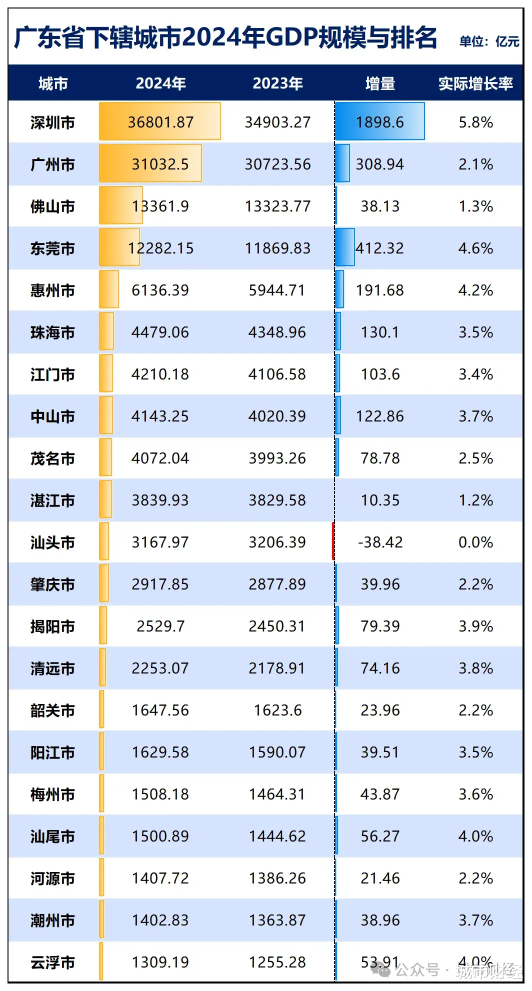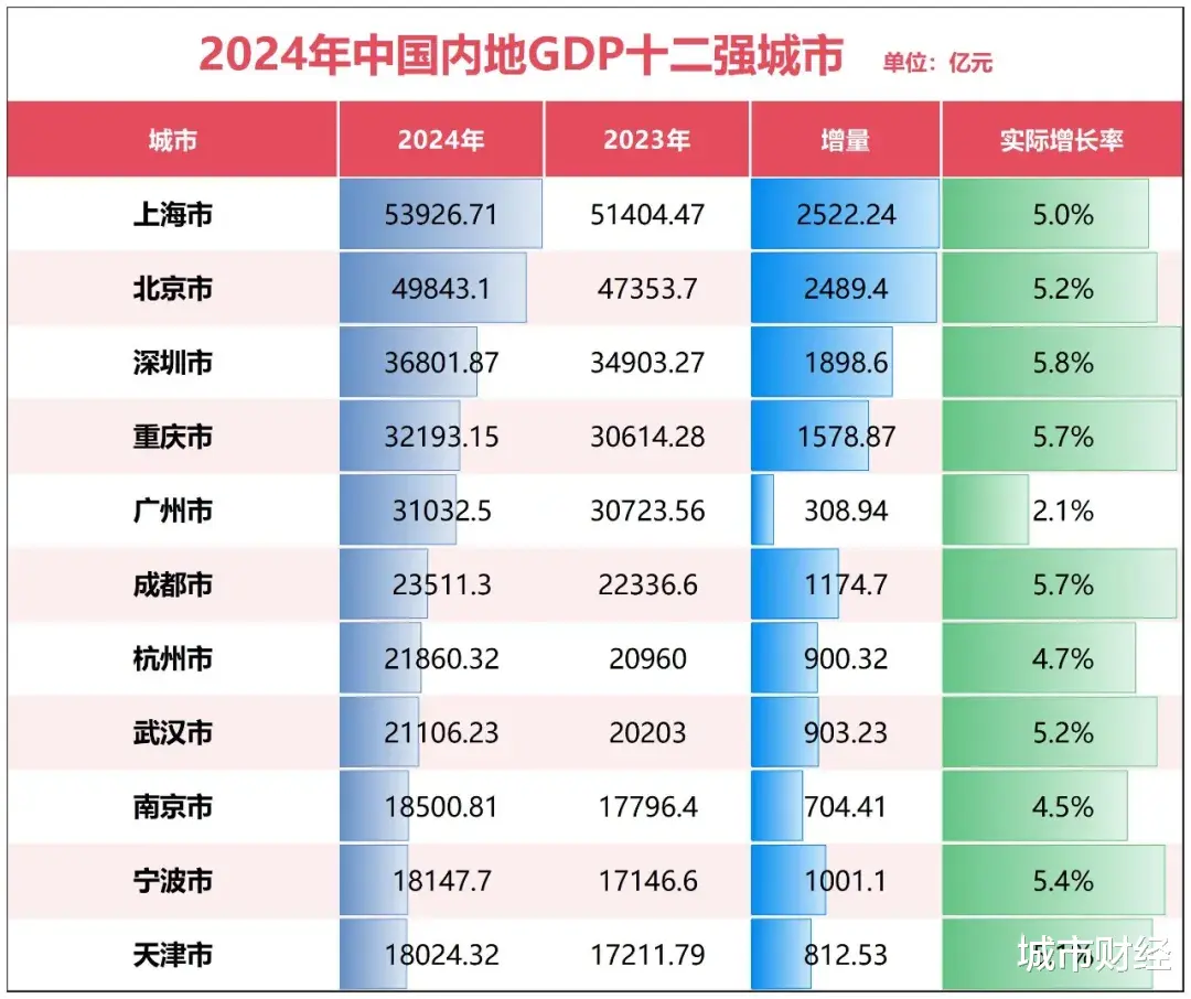 2024年,广州GDP增速2.1%,增量308.94亿元,在十强城市中,无论增速还是增量,均倒数第一。