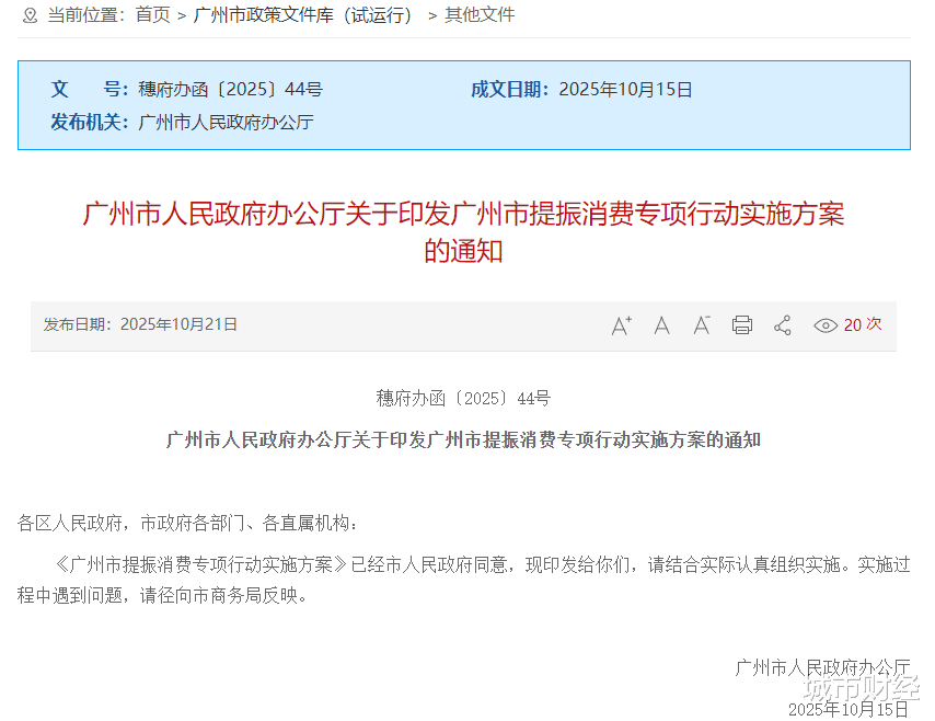 一份是10月21日发布的《广州市提振消费专项行动实施方案》。
