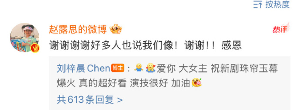 不过两人对话,让「赵露思回应和刘梓晨长得像」关键字冲上热搜,有粉丝称赞赵露思格局大、心态好,也有人认为两人根本不像,赵露思根本不需要这样回应。另外,不免有酸民借机嘲讽:「说长得像有点过分了,应该说是整得像」。
