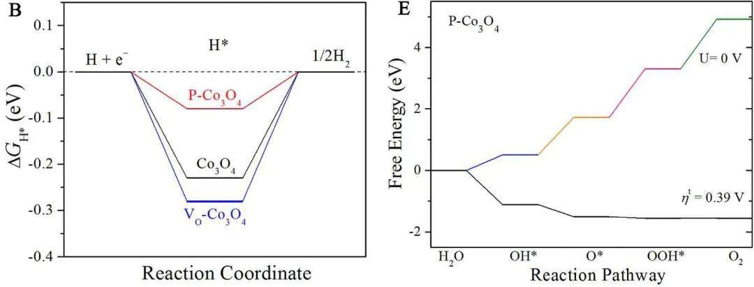 电子结构调控机制这种Co²⁺位点的富集优化了H*的吸附能,接近HER的理想值;同时,电导率从原始Co₃O₄的10⁻⁵ S/cm提升至P-Co₃O₄的10⁻¹ S/cm,源于P的掺杂引入了更多自由载流子。