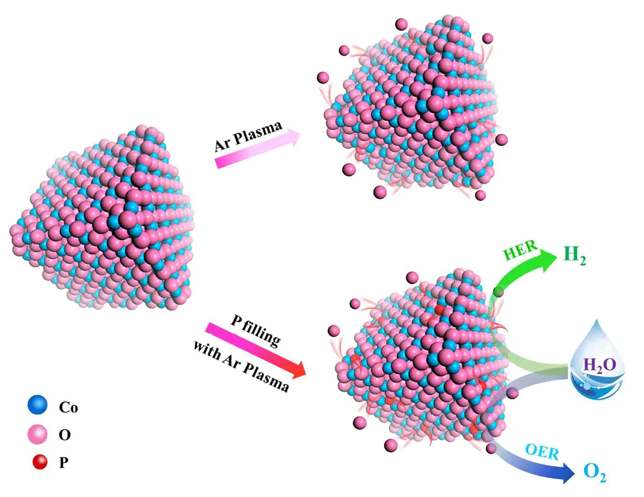氩等离子体刻蚀纳米片,通过高能离子轰击移除表面氧原子,形成高密度氧空位(Oᵥ),同时引入磷原子填充空位形成P-Co₃O₄复合结构。