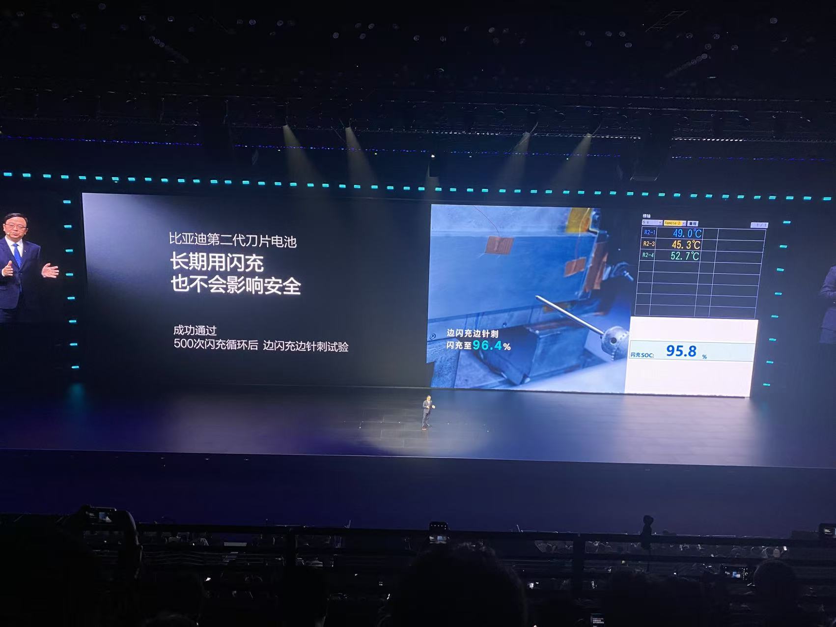 但如果你们仔细了解过二代刀片在安全方面的一些细节,你就会意识到,关于二代刀片的寿命争议,以及闪充是否对二代刀片有损伤,安全测试中的一些数据同样可以从侧面佐证一些问题。目前公开的测试中,比亚迪做了三个实验,分别是:500次循环后的边闪充边针刺实验、热扩散实验和底部撞击实验。