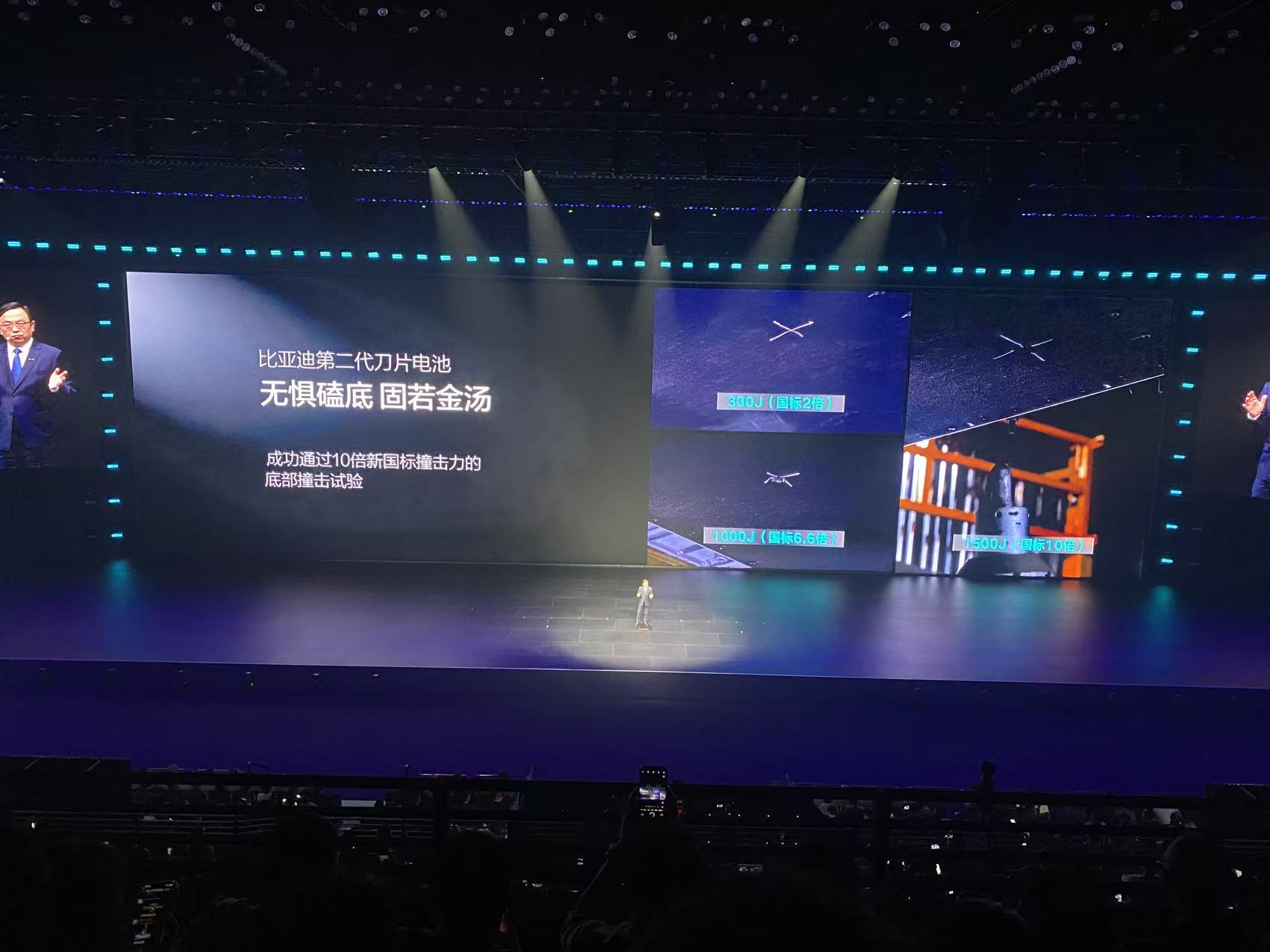 再说底部撞击实验,这个实验考察的是电池整包遇到变形、扎穿时的安全性。第二代刀片电池,在新国标的标准基础上,成功挑战10倍新国标撞击能量的底部撞击试验,电池不起火、不爆炸。