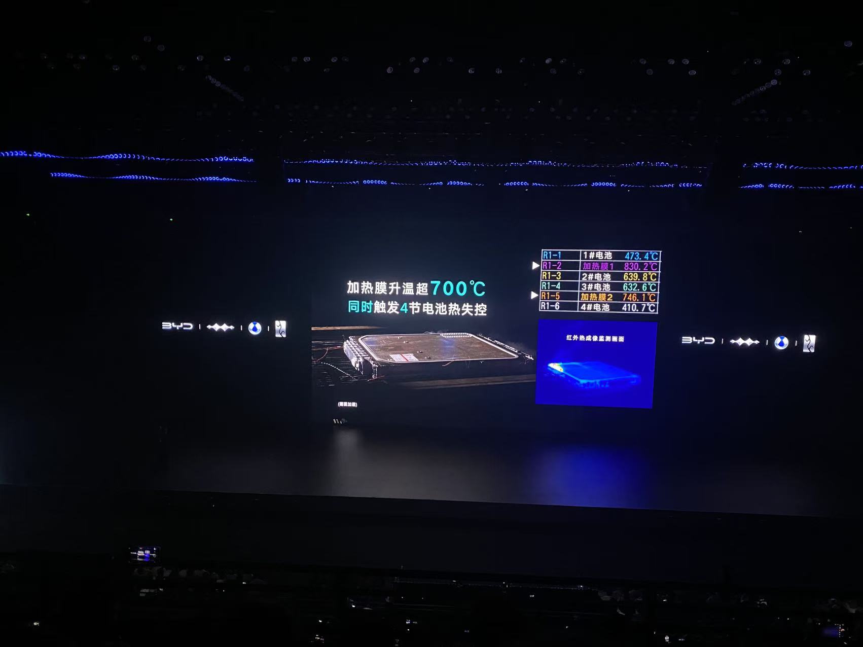 其中后两个实验,就是纯粹的安全实验。先说热扩散实验:新国标要求,电池包因内部短路引发热失控后,不起火、不爆炸。新国标标准是触发1节电池热失控,而第二代刀片电池挑战同时触发4节电池短路,周围的电芯依然保持正常温度,没有引起热扩散,没有起火、没有爆炸。