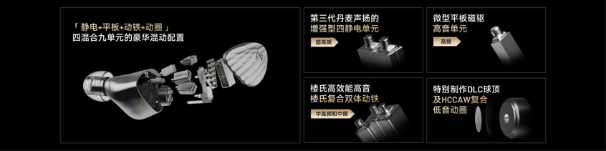 核心配置:四混合五分频九单元设计,含第三代丹麦声扬增强型四静电单元(高频延伸至 70kHz)、微型平板磁驱高音单元、楼氏中高 / 中频动铁单元、DLC 球顶复合低音动圈(搭配 HCCAW 高张力线圈);380μm 厚镀银分频电路,独立 3D 打印声腔 + 空间泛音增强结构。