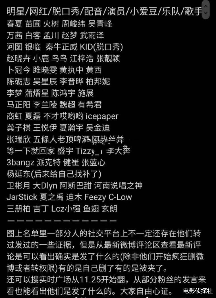 根据网友统计的名单,其中涵盖了明星、网红、脱口秀演员、配音演员、歌手等不同行业的公众人物,而完整的名单包含了数十人,涉及范围很广,其中不乏有大家熟悉的公众人物。