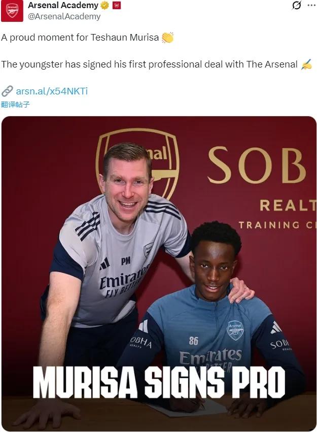 官方:阿森纳宣布和特尚-穆里萨签下了他的首份职业合同。