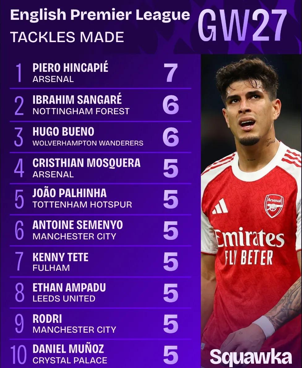 Squawka统计,因卡皮耶在对热刺的比赛中完成了7次铲断,是本赛季阿森纳球员在单场英超比赛中铲断次数并列最多的(廷贝尔对曼城)。