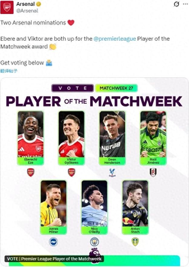 官方:埃泽和哲凯赖什都被提名为了英超上周最佳球员候选。