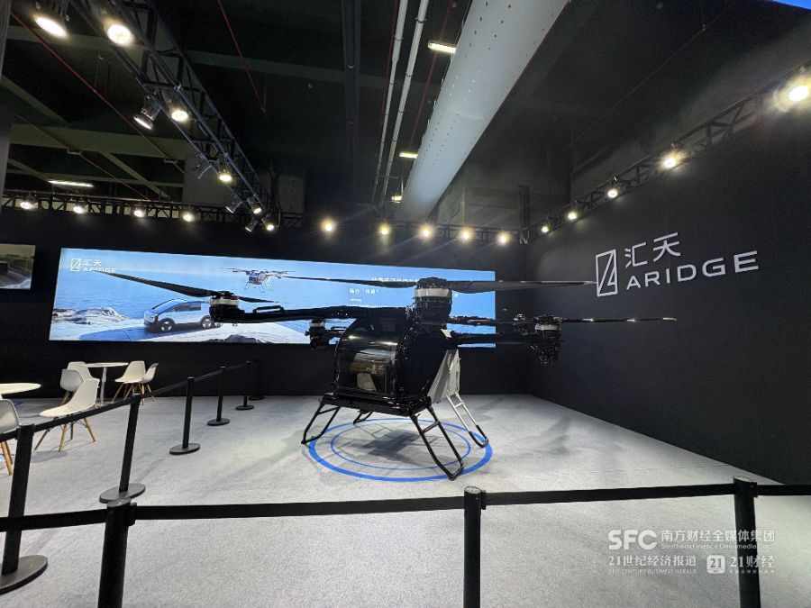 在东方枢纽国际商务合作区展区,小鹏汇天展出了“陆地航母”飞行器,御风未来也展出了M1 eVTOL的1:5缩比机。