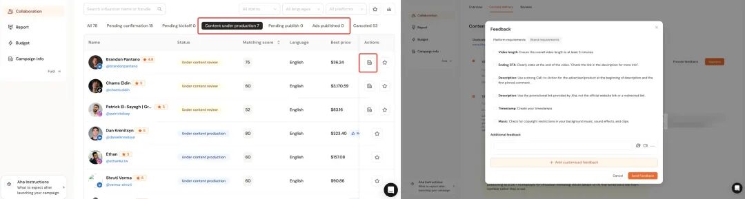 已经确认合作意向并完成价格谈判的达人,将统一进入品牌的待审核列表。数据显示,在Aha平台上,品牌最快在48小时内,就能获得一份已确认合作意向与最终价格的优质达人清单,从反选到落地的折损被降到最低。值得一提的是,在Campaign持续运行期间,达人仍可持续接单,清单相应不断新增,品牌始终拥有可反选、可推进的达人储备。