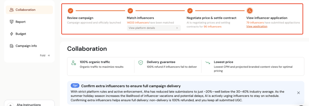 Aha将所有达人合作执行过程都沉淀在一个可视化的平台上,彻底告别散落的表格、邮件和群聊。全局进度一览无余,从AI匹配了多少达人、建联进展,到多少达人已确认合作,所有状态一目了然。