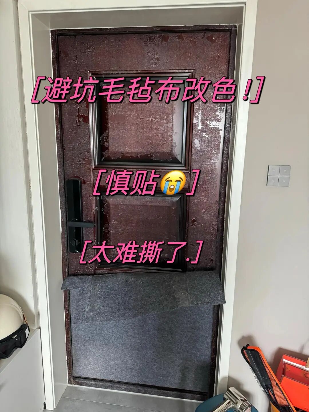 开发商的入户门,清一色的猪肝红,丑到爆炸,于是网上就流行用毛毡DIY入户门,说是“低成本改造,颜值翻倍”,好多网友都做了,结果全踩坑!