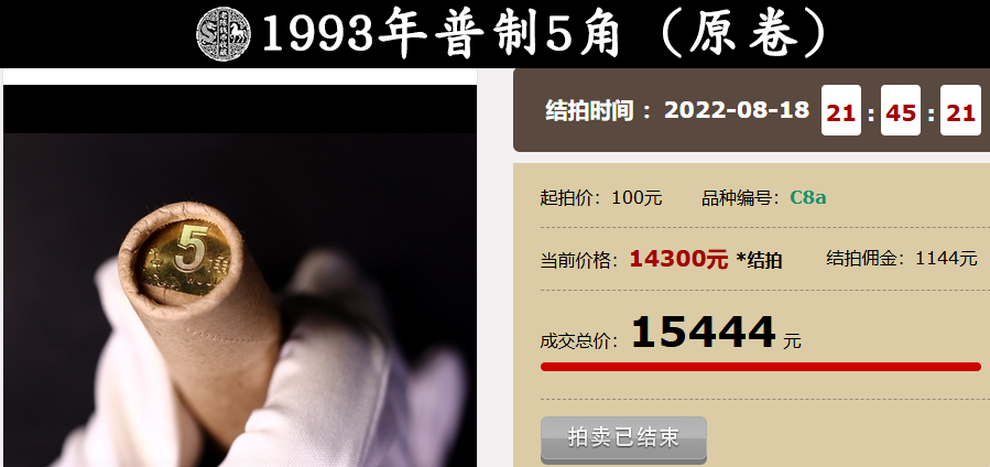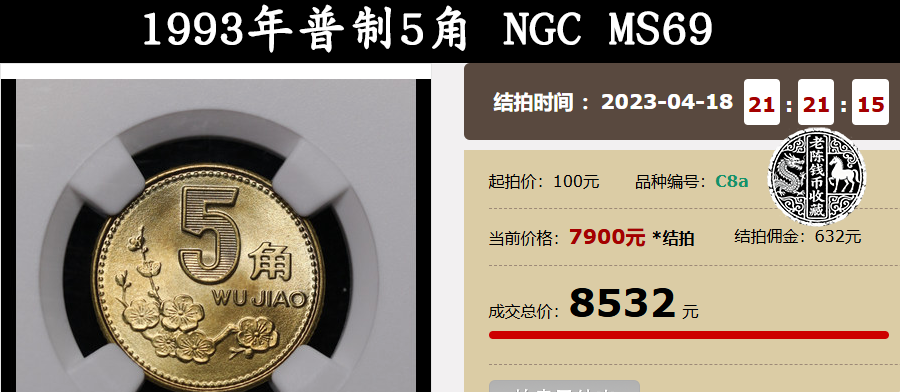 特别是那种当年流通使用过的,从上面的报价中,可以看到,也就0.62元一枚而已。这些都是指的普通年份的,要说这其中最特殊的要算1993年的梅花5角,毕竟现在可是称为梅花5角“流通之王”呢!为了让大家能清楚的认识到它的价值,咱们看看下面这组拍卖数据就明白了。