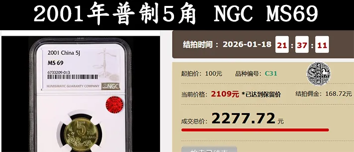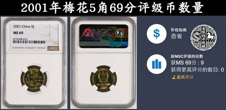 就比如上面这一枚2001年的梅花5角硬币,在今年1月18号刚结束的现代钱币月拍上,就以2277.72元的价格被拍出。这枚梅花5角,品相简直是没得说,它是一枚NGC MS69分的评级硬币。从它的评级编号可以查询到,在2001年的梅花5角硬币中,获得这个分数的只有9枚。