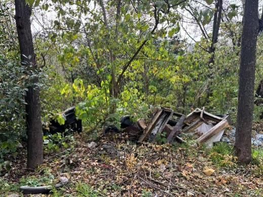 路边林中,有废弃的景观石造型,也有各种不明所以的垃圾,还有大小便的显著痕迹。