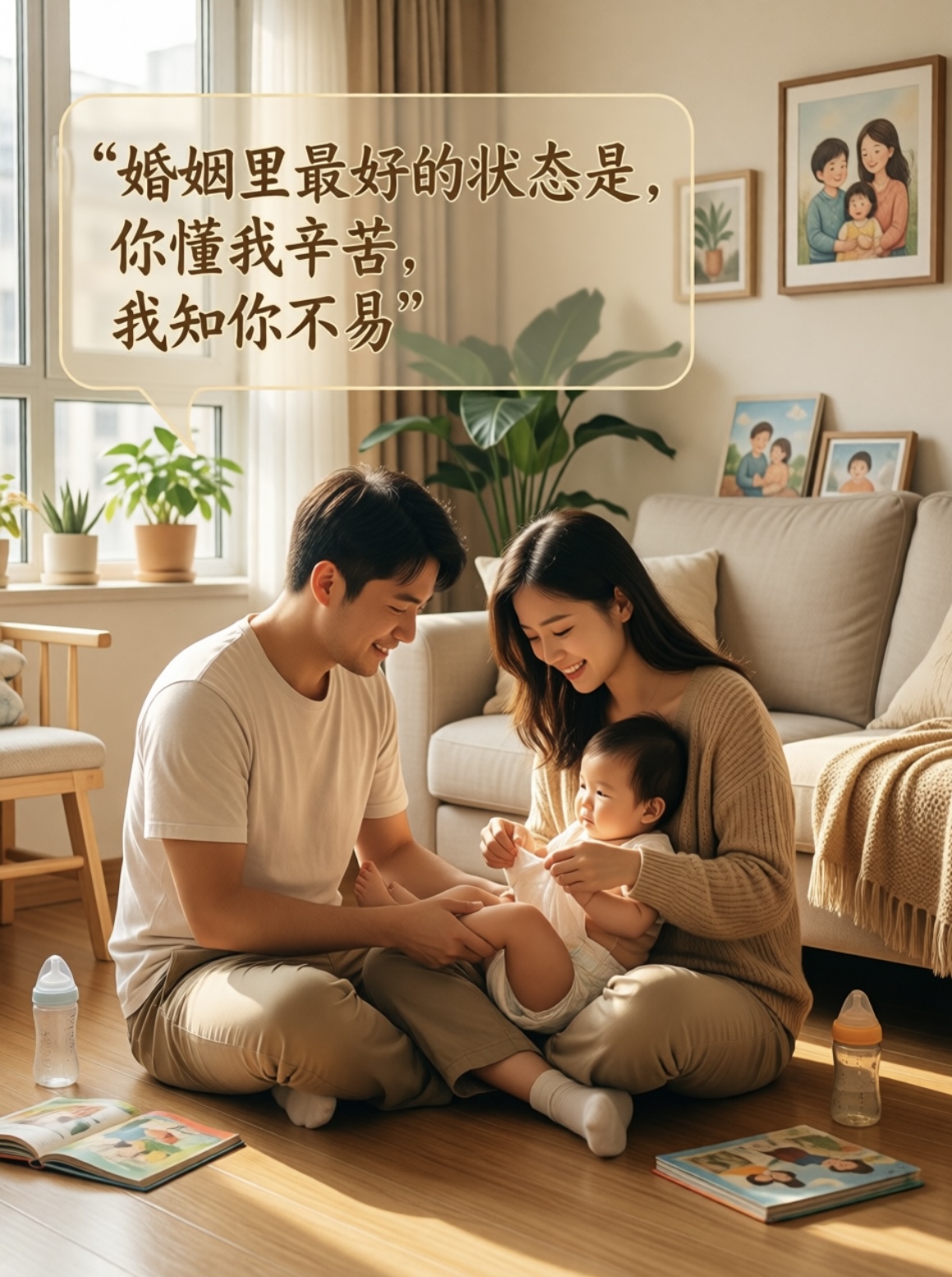 婚姻就像一场漫长的接力赛,有了孩子之后,赛道变得更长,障碍更多,但只要我们懂得彼此的辛苦,理解对方的不易,就能在疲惫的奔跑中,找到那份最温暖的力量。你懂我的手忙脚乱,我知你的负重前行,这就是婚姻里,最好的状态。
