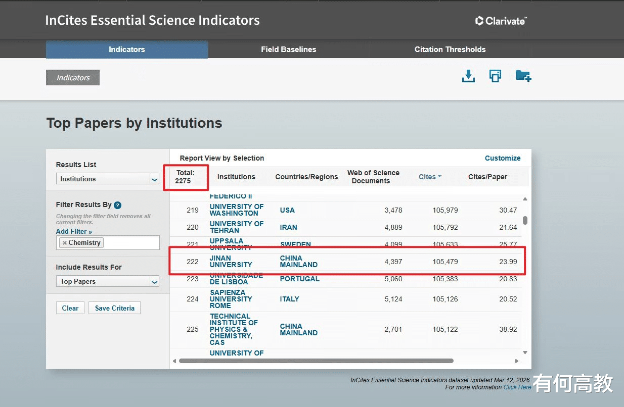 2026年3月12日,科睿唯安“基本科学指标数据库”(ESI)公布的最新数据显示,暨南大学化学学科在全球2275家上榜机构中位列第222位,排名前0.996‰,正式迈入世界一流学科行列。这并非学校的偶然突破,而是其长期深耕学科建设的必然成果——在此之前,学校已有药理学与毒理学、环境科学/生态学、工程学、材料科学4个学科进入ESI全球前1‰,此次化学学科的加入,让学校进入ESI全球前1‰的学科数量增至5个,再添一张“世界一流”的学科名片。