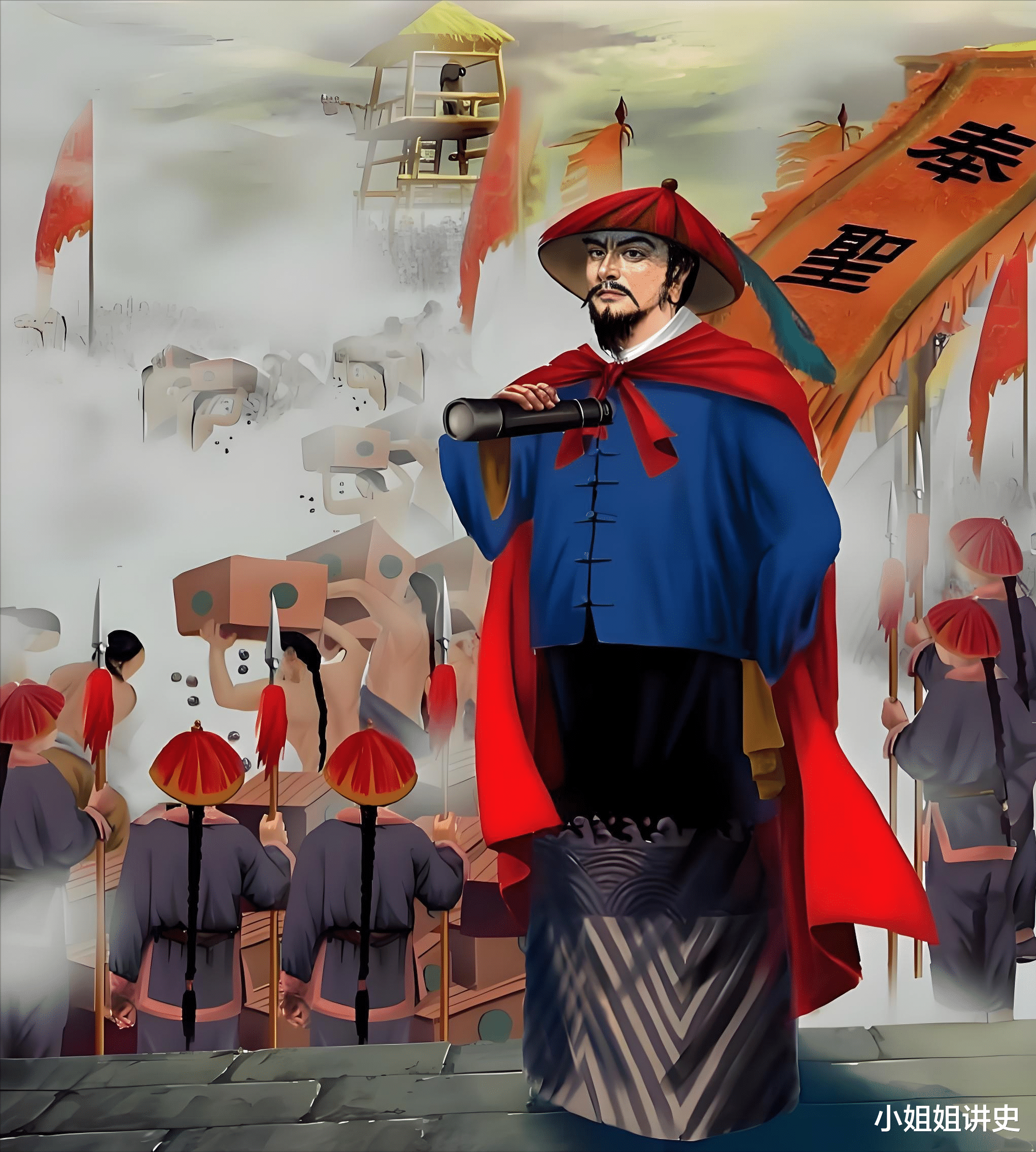 隐约一高大魁梧的男子,趟着水来到永历帝身边,不由分说抓起永历帝的胳膊,一把将他背起,大步走向岸。