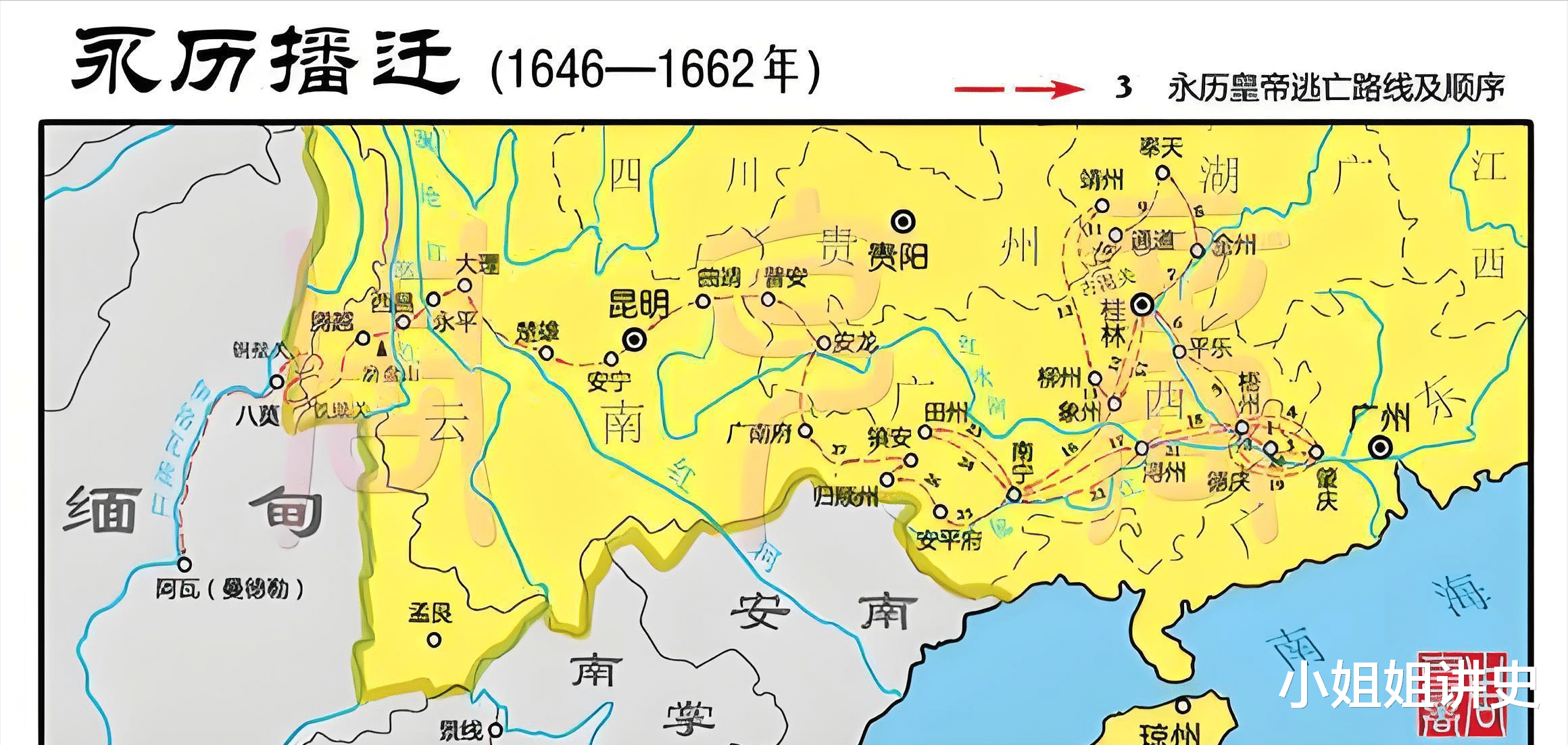 1656年,朱由榔因清军的不断进攻,在李定国护送下从安龙抵达昆明,住在孙可望的秦王宫,获得短暂安定。第二年孙可望投降了清朝,将西南的军事情报全部出卖,朱由榔的行踪也被清军完全掌握。