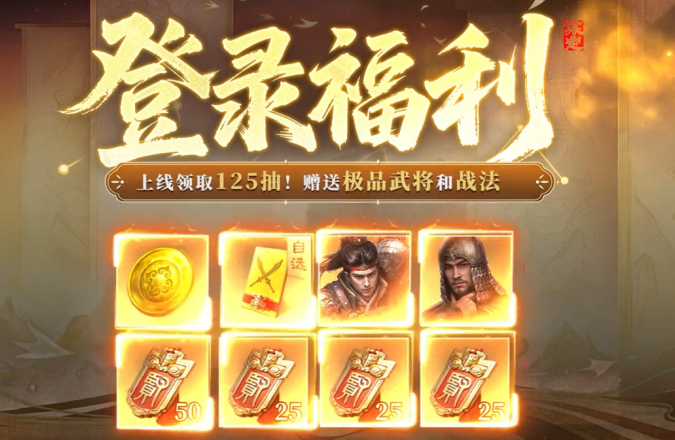 开服前七天,还免费送125抽卡券、2480黄金及多个橙将战法。这么多的抽卡券和黄金,足够大家去抽取心仪的武将和购买所需的道具了。而且橙将战法的赠送,也让大家不用为了战法而发愁。