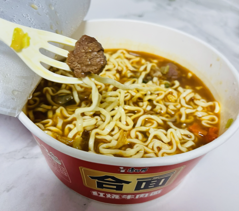 还有合麵,能对打外卖的泡面,我称它为“正餐级扛饿王”!以前总觉得泡面只能垫垫肚子,合麵却让我知道,泡面也能吃得很精致,有菜有肉摆脱了固有认知,将泡面带到了正餐的餐桌上。它的料包超级实在,肉粒比普通泡面大一圈,咬下去肉香四溢,蔬菜包也鲜得像刚从菜市场买回来的。再配上那浓到能裹住面条的汤底,一口下去,满满的幸福感,一碗就能顶饱到睡前,简直是加班族和懒人的福音!