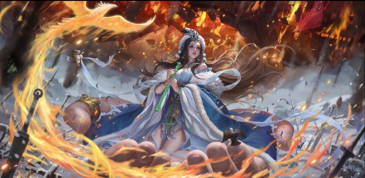 背景非常宏大,山石从天空砸落带来强大的压迫感,仿佛汉末黑暗无光的时局。但宏大的背景没有削弱丝毫人物的美感。