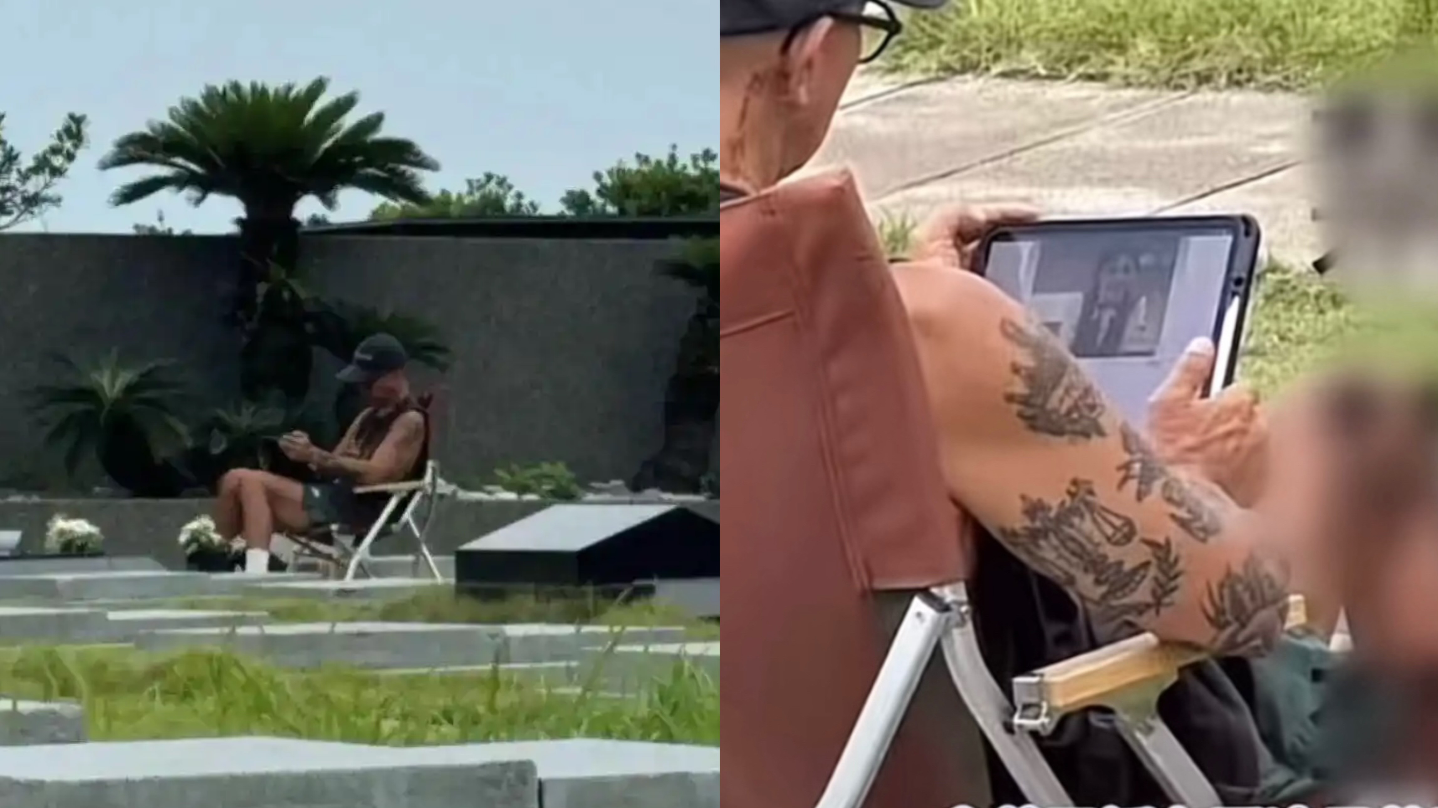 后来,好像有朋友来看他,于是他又贴心得支起一把大的黑色遮阳伞,又加了一把沙滩椅。