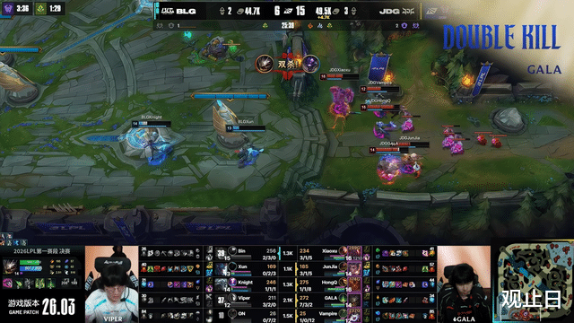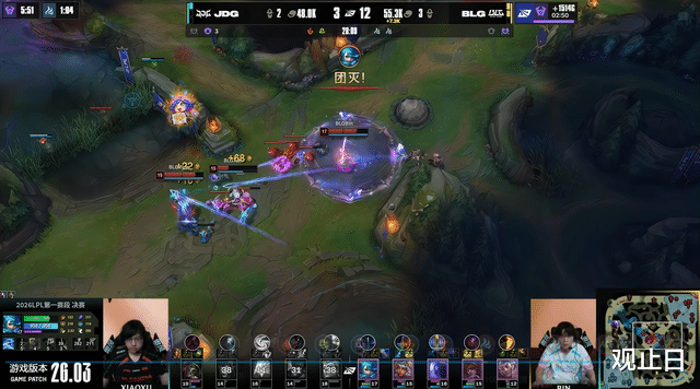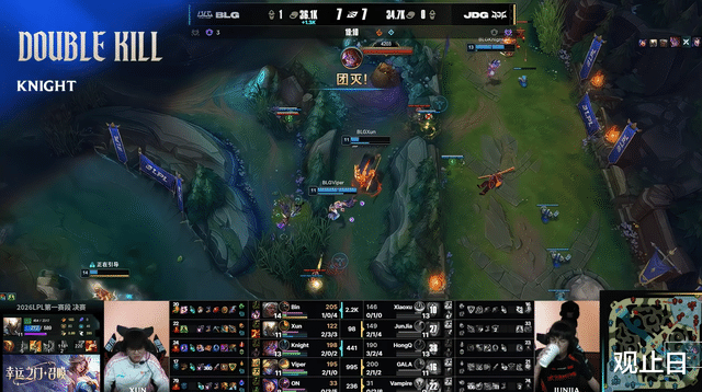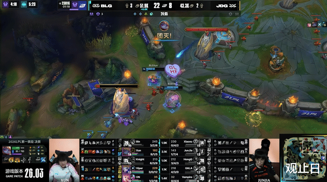 前期JDG一度领先,小龙团打出0换3,形势大好。结果第19分钟,Xun下路抓死Xiaoxu贾克斯后,GALA芸阿娜在队友没到场的情况下直接脸探草丛被秒,BLG打出0换5瞬间翻盘。