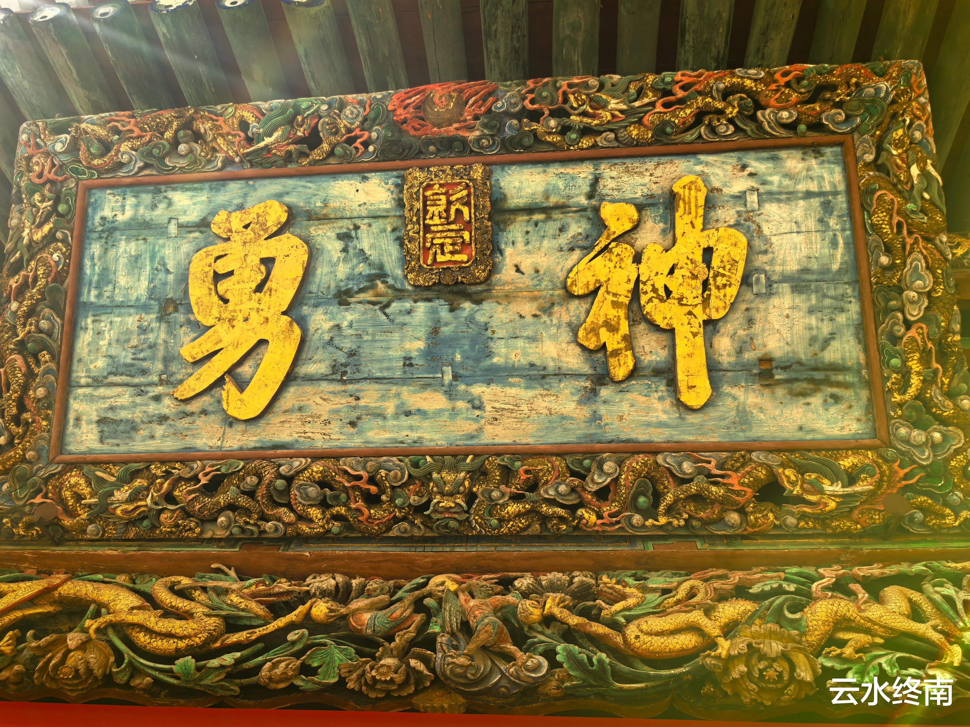 正方是乾隆皇帝题写的“神勇”二字,要是不仔细读,就读成“男神”,这也没错,关老爷可不是咱中国人心目中的“男神”么?
