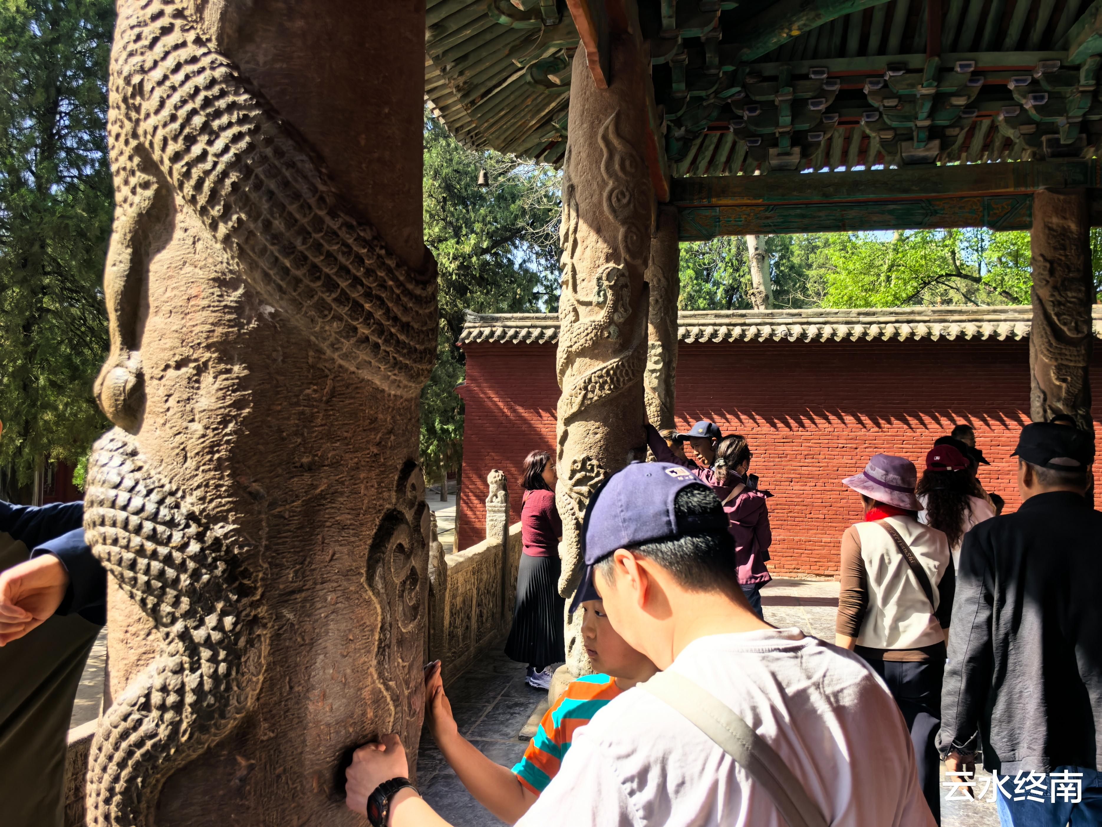 崇宁殿的石头大柱子也是一绝。这里有26根雕刻着碧水赤崖蟠龙的石柱子,都是用整块的石头雕刻而成,实为罕见。