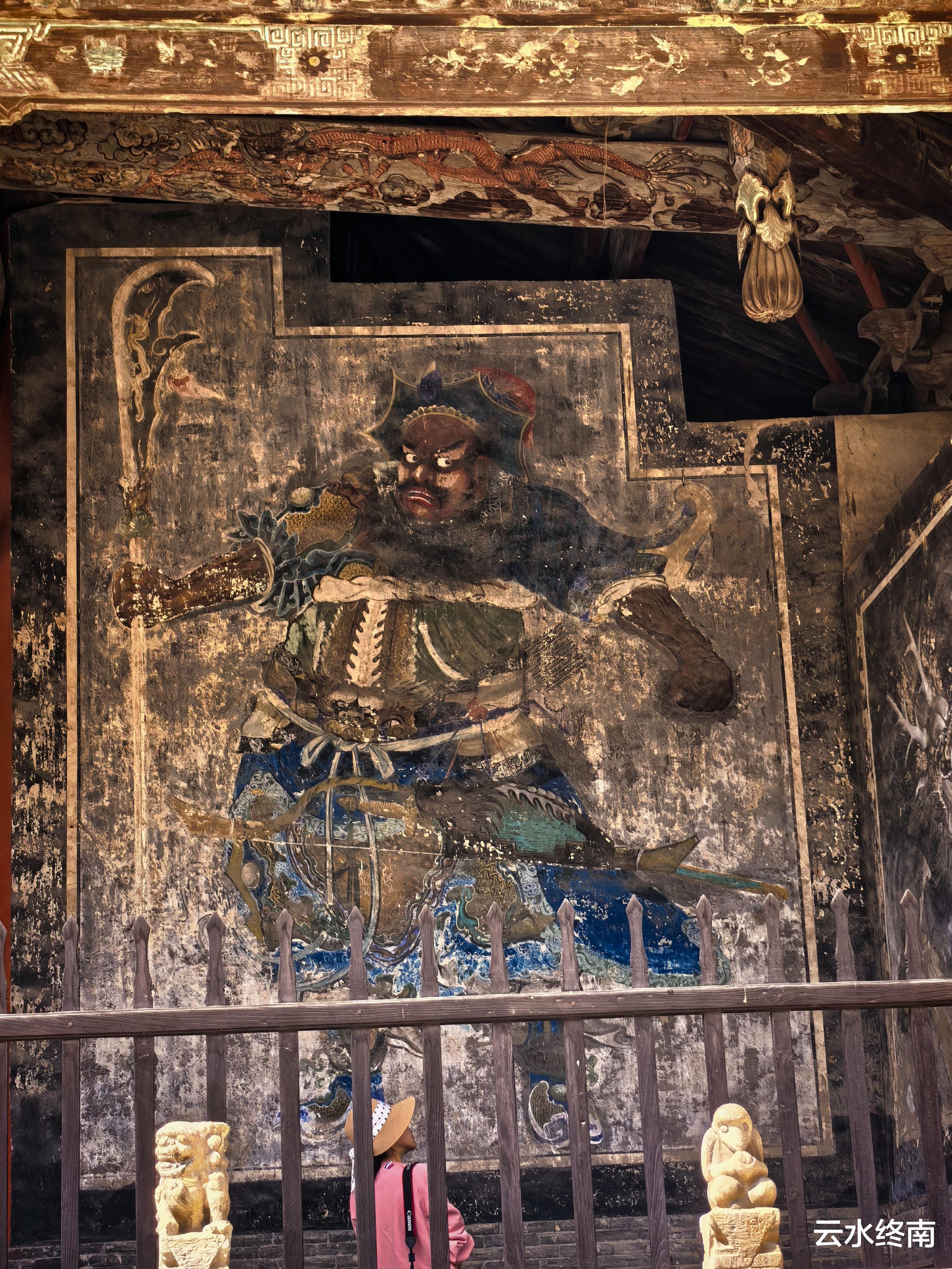 里面还有“左青龙右白虎”的巨型绘画,其他就是关羽戎马一生的绘画,只是没有“走麦城”。全国的关帝庙,都没有二爷走背字的这个图。