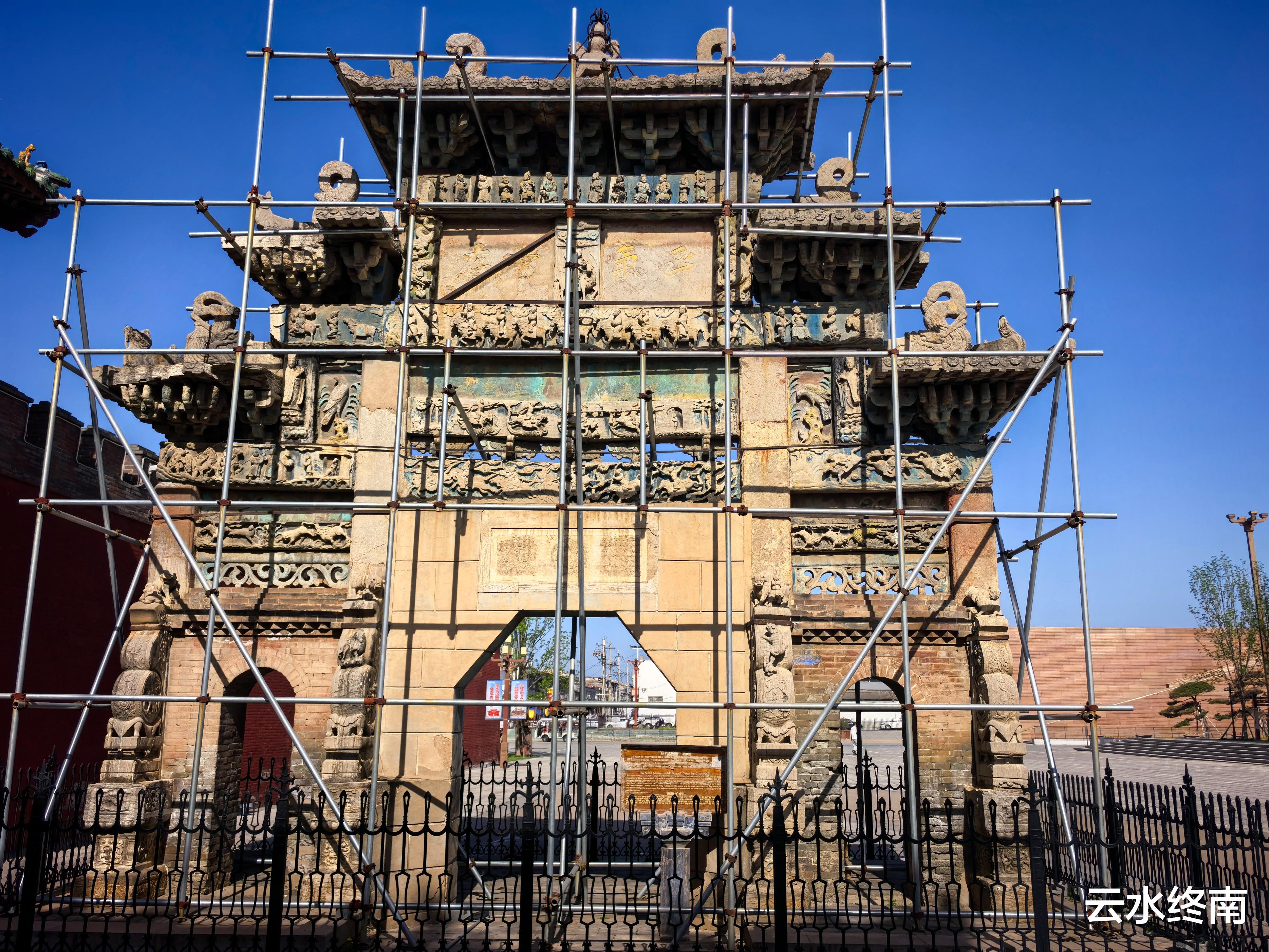 沿着东侧返回,在东门看到这个修复的石牌坊,雕刻精美。